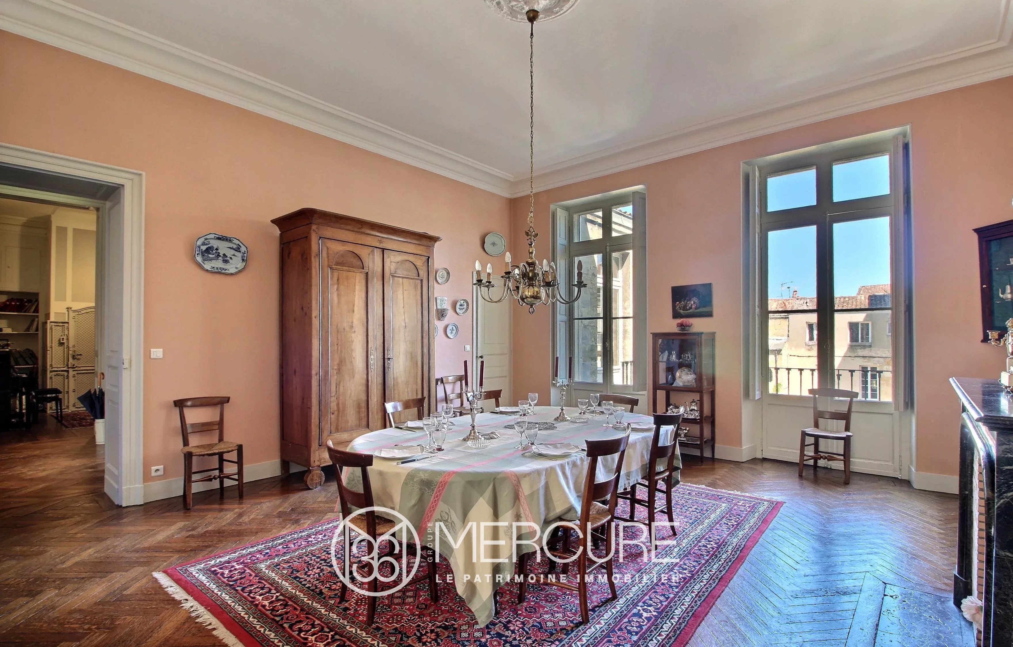 – a dining room of 33m ² with parquet floor and fireplace, very bright with 2 double large windows,
