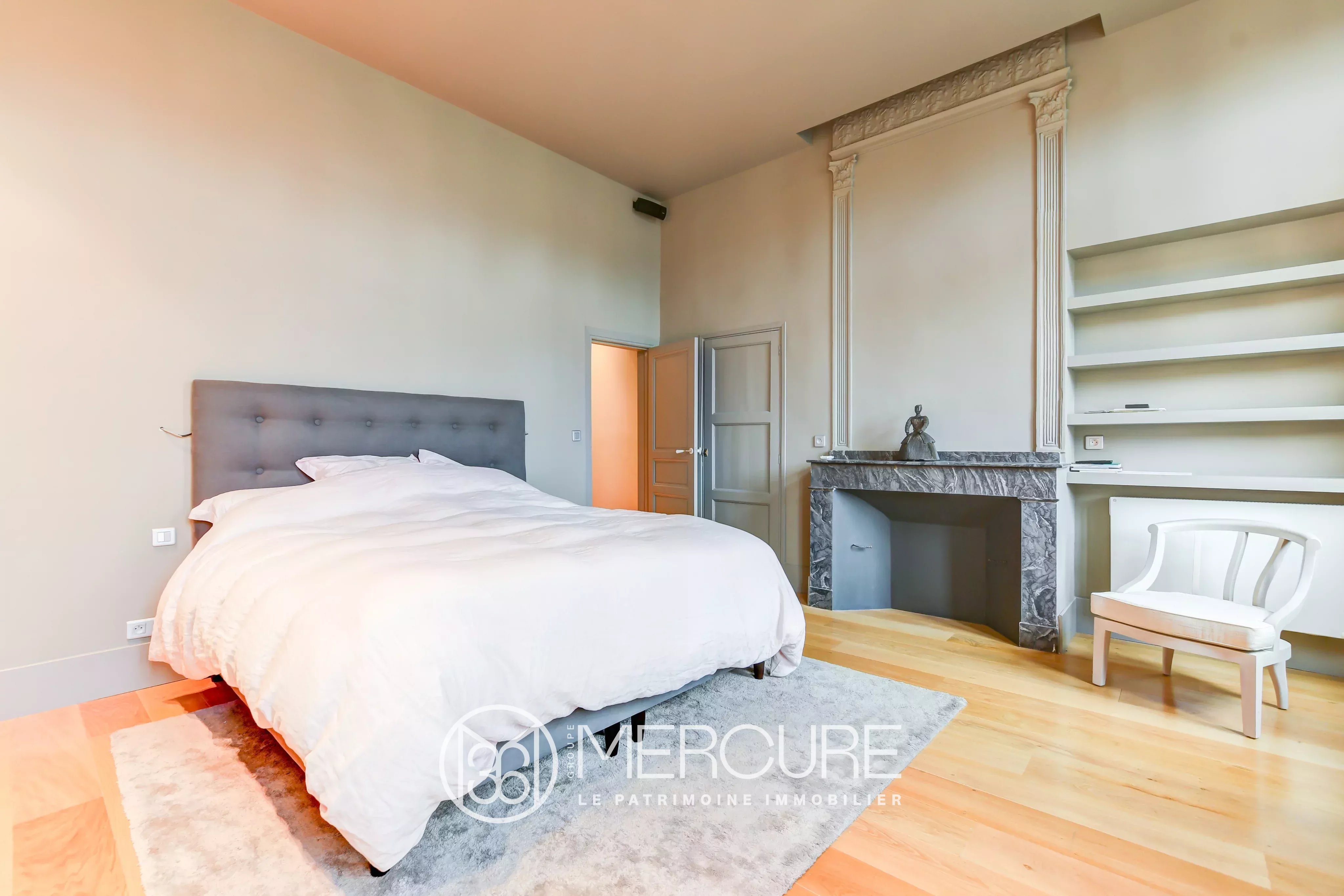 On the third floor of a bourgeois building with lift, superb 135m² apartment completely renovated by a renowned architect. Very nice mix of old and new. It consists of a 28m² living / dining room opening onto a high-end fitted kitchen of approximately 23m², a master bedroom with dressing room and a bathroom with shower and bathtub, a second bedroom with bathroom, an office / bedroom and 2 storerooms.
