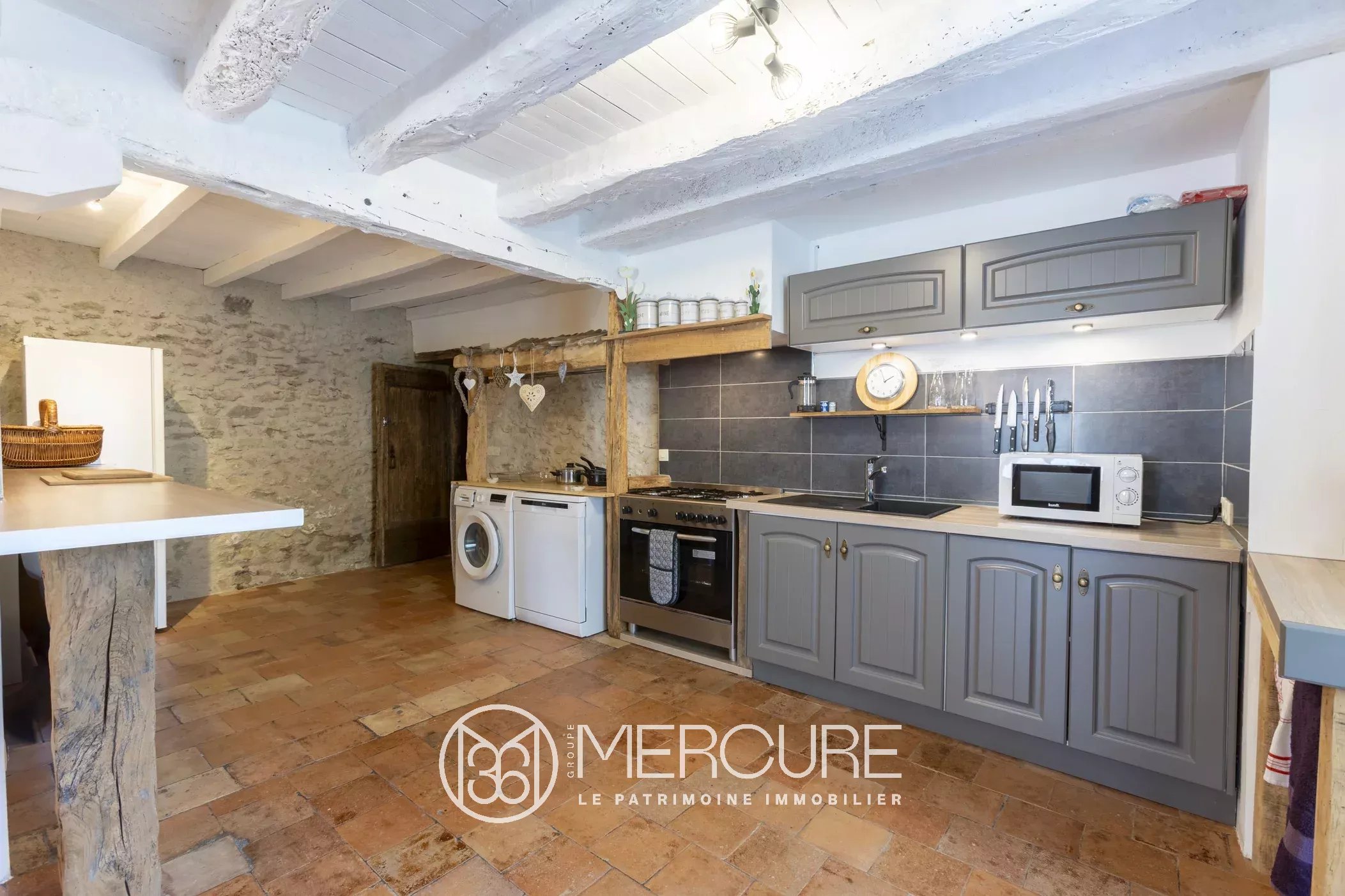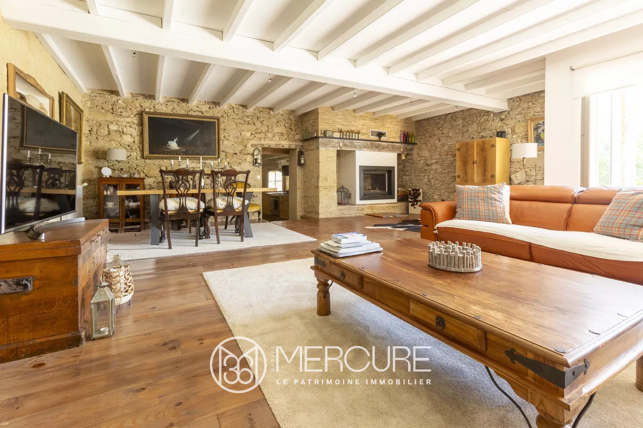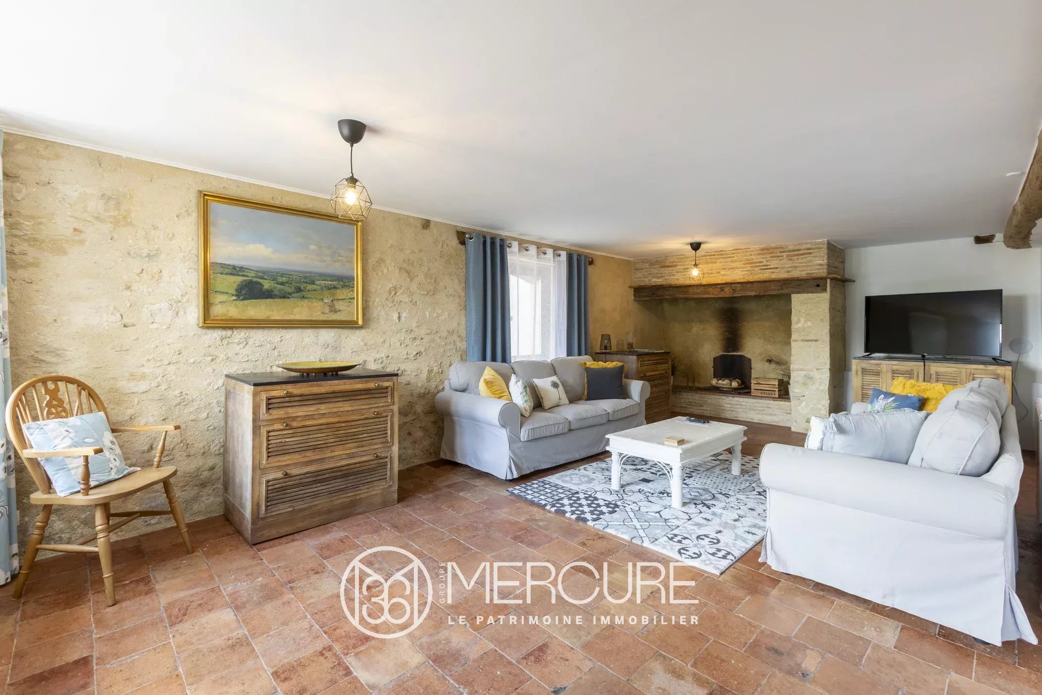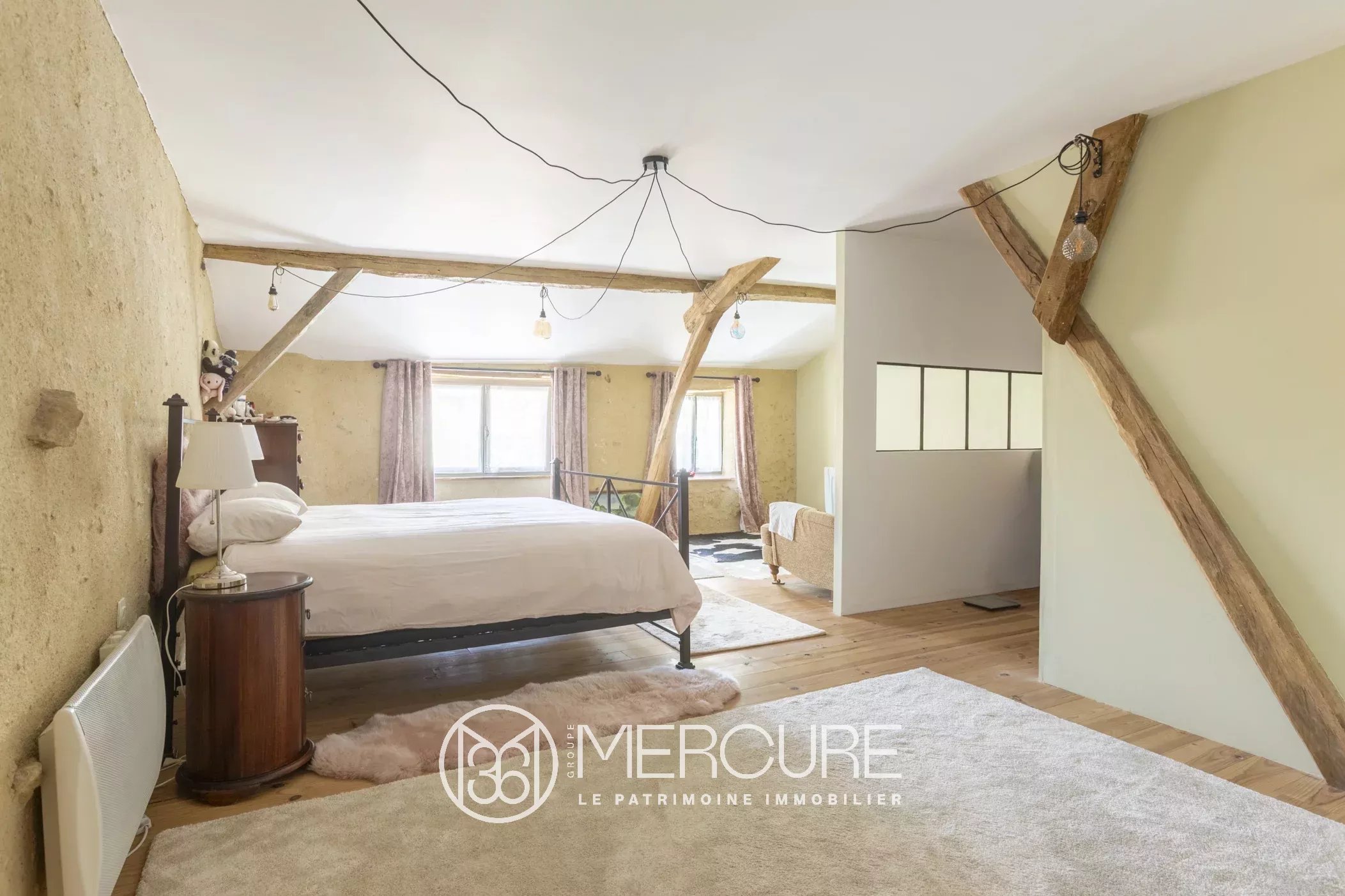 The second part is converted into a guest house, with a rustic-chic atmosphere, featuring a 47m² living room/kitchen, a lounge with a fireplace, two beautiful bedrooms upstairs, a modern bathroom, and a separate toilet.