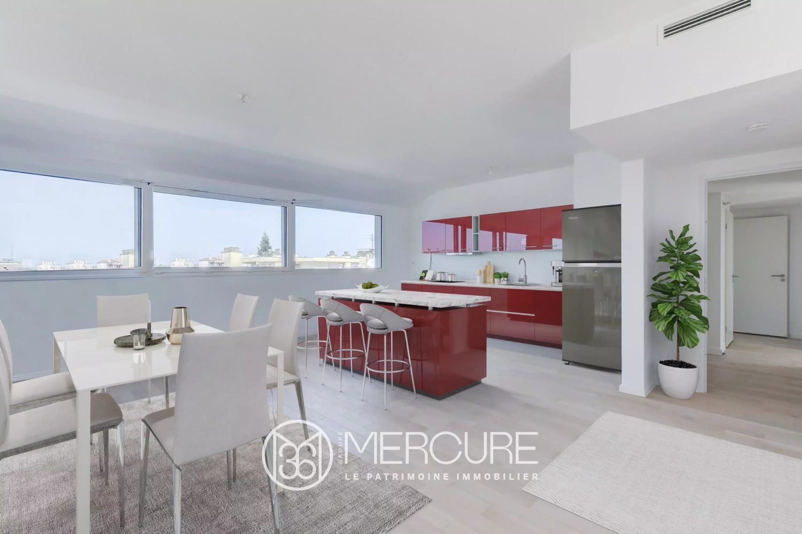 Entrée principale, séjour-salle à manger de 60 m2, cuisine US aménagée, une chambre avec dressing ou bureau, une salle d’eau, wc indépendant, une suite parentale avec son dressing et sa salle d’eau. Au rez-de-chaussée du duplex : une chambre avec sa salle d’eau et wc, kitchenette, grand balcon.