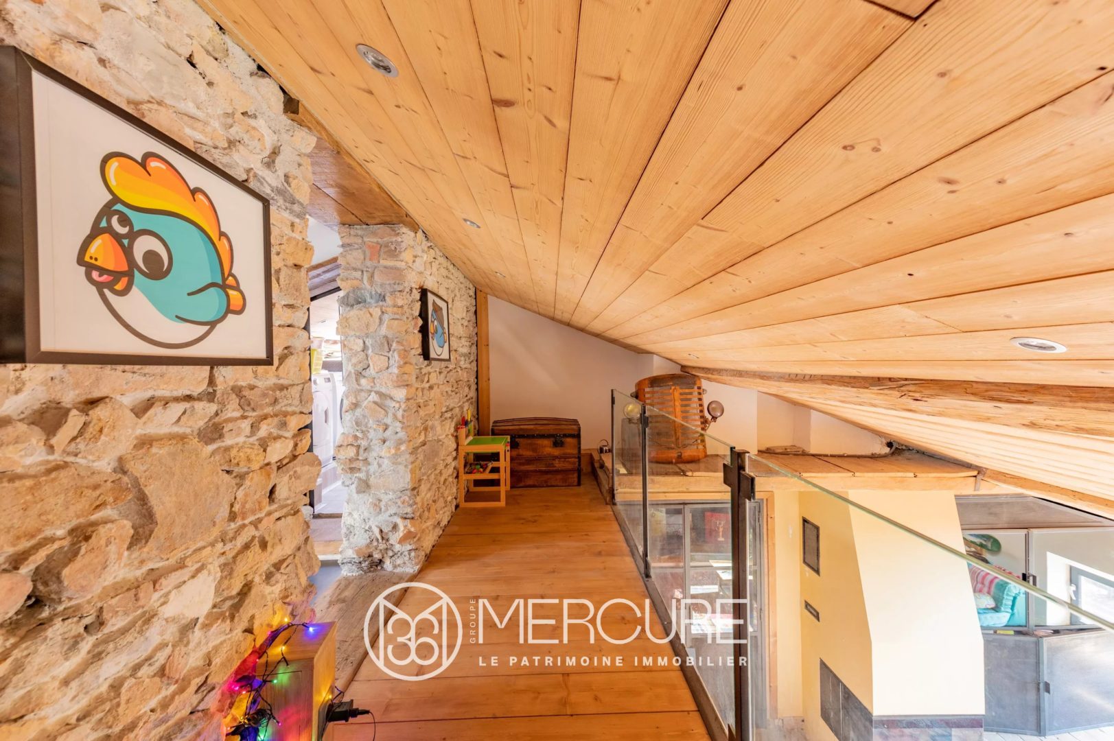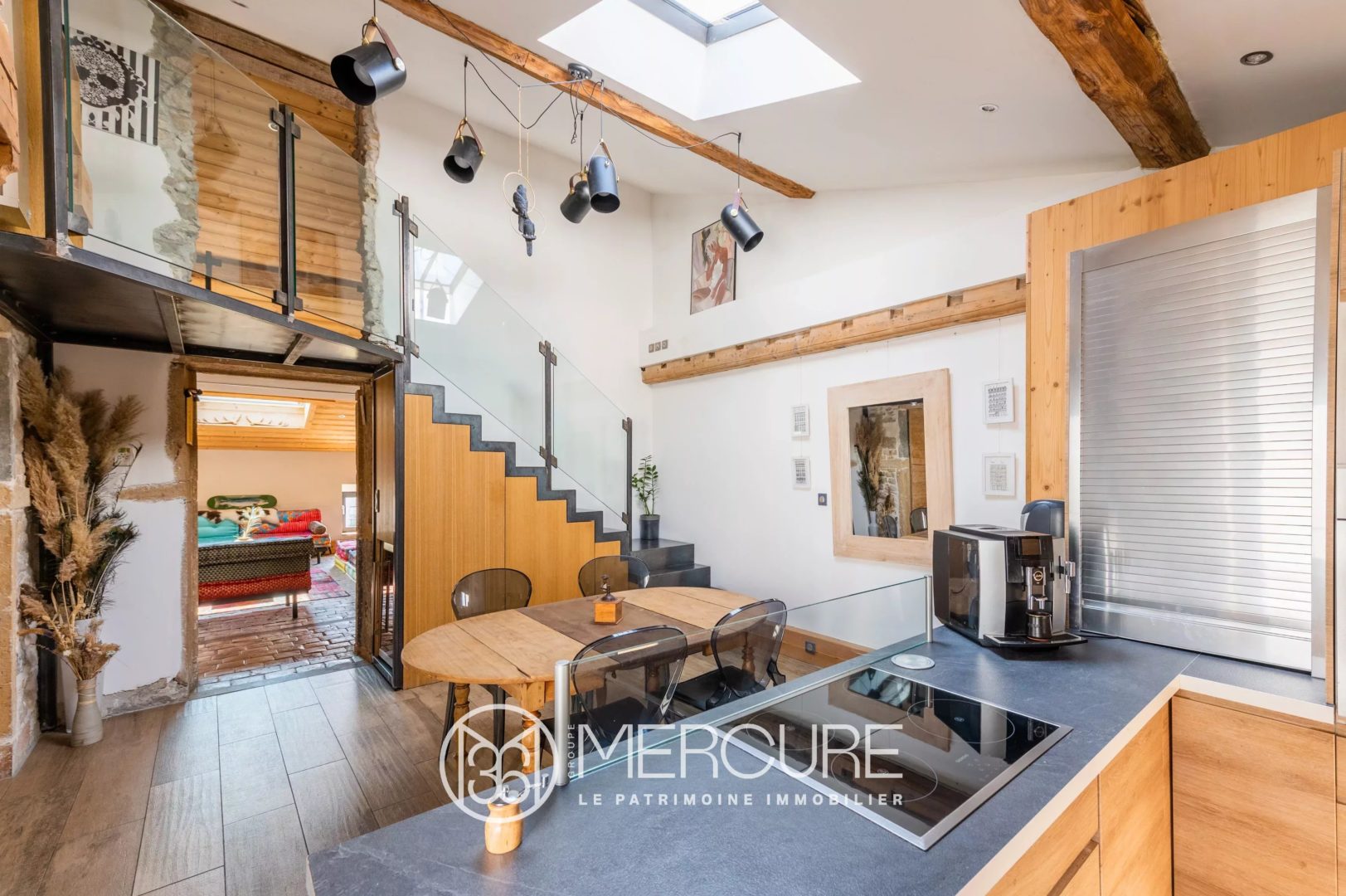 Une jolie cuisine équipée avec cave à vins, dispose d’un bel escalier menant à une mezzanine avec garde corps vitré (desservant un espace buanderie).