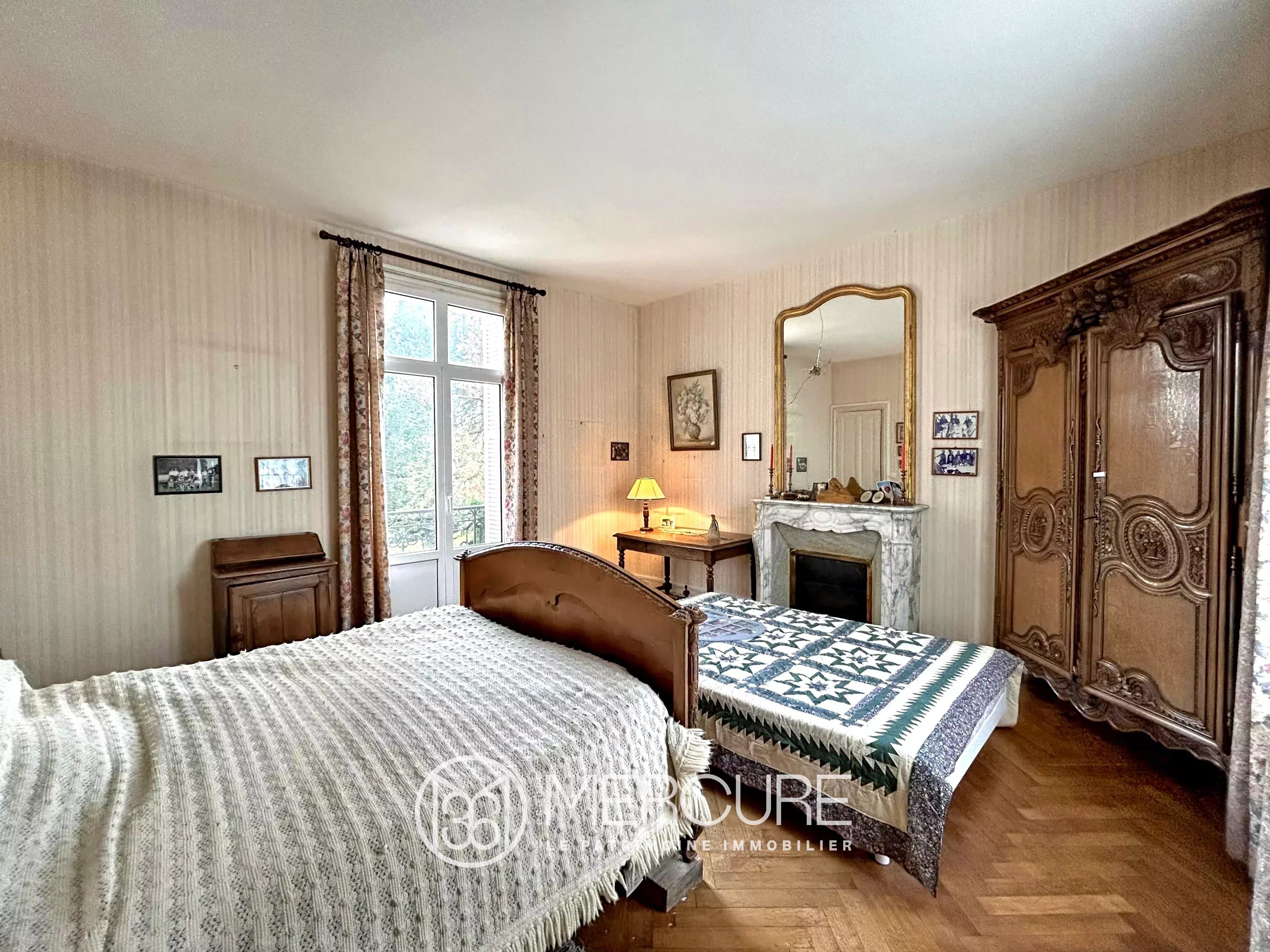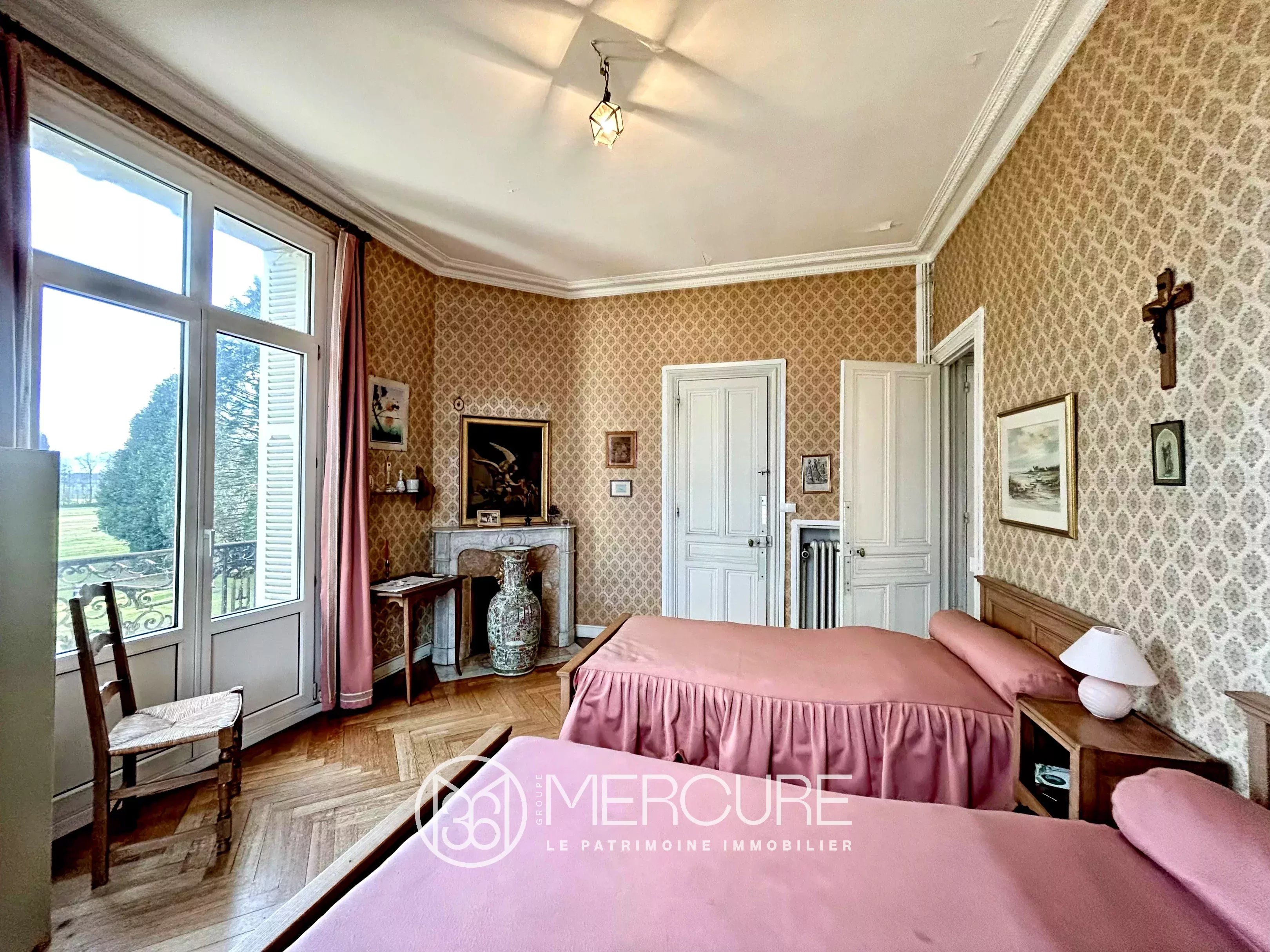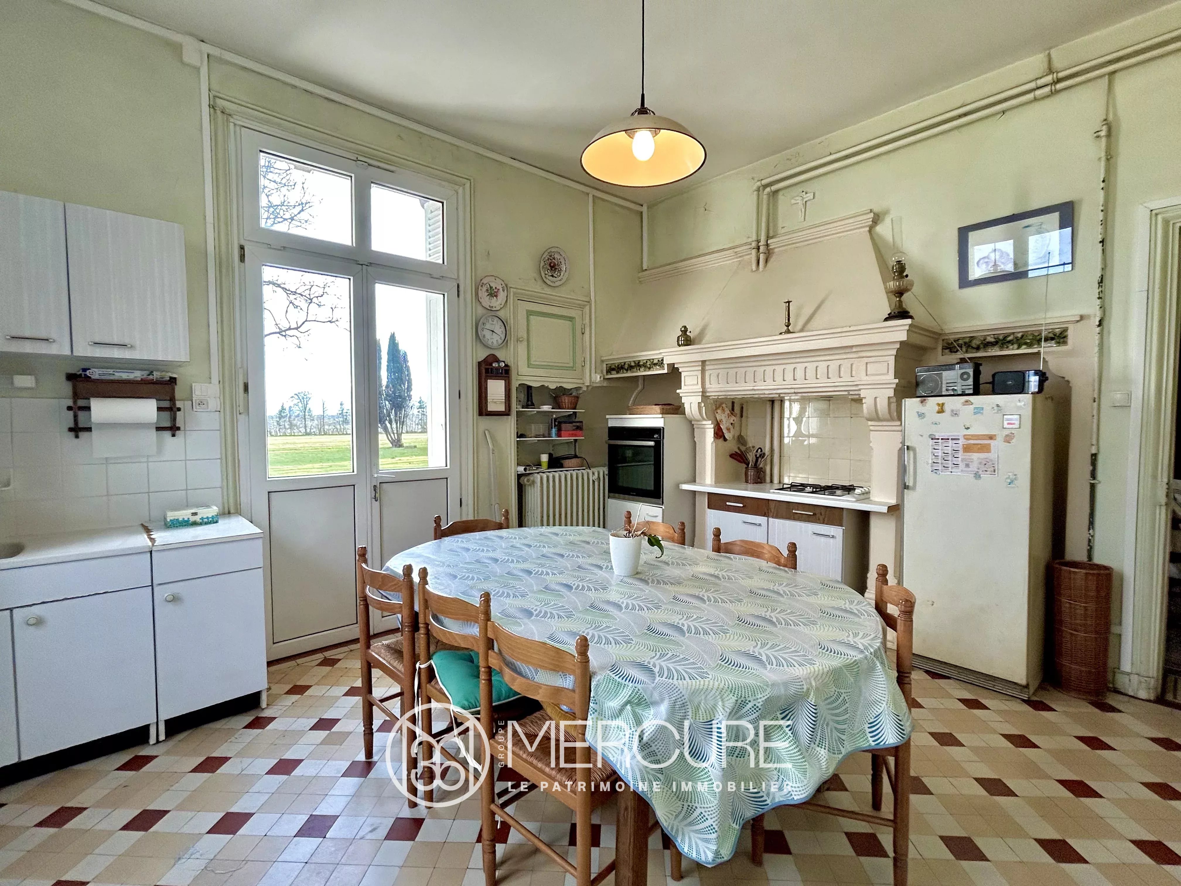 To the left, a dining room and to the right, an elegant, light-filled living room. The reception rooms feature large volumes, fireplaces and a warm atmosphere.