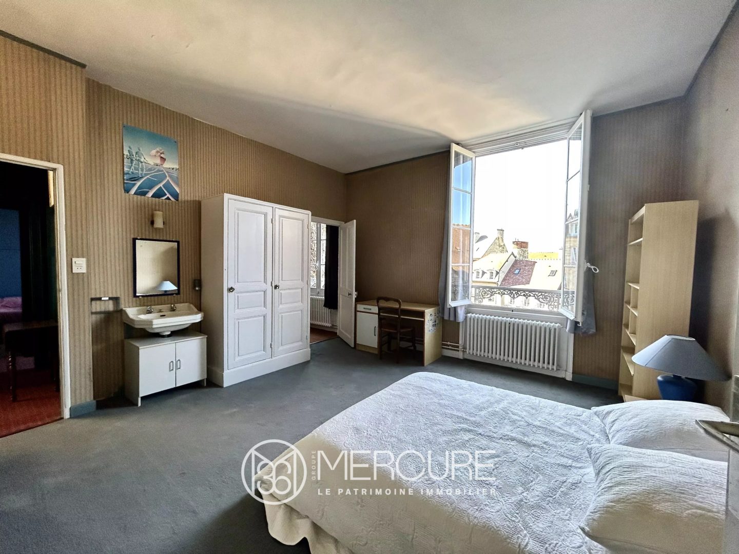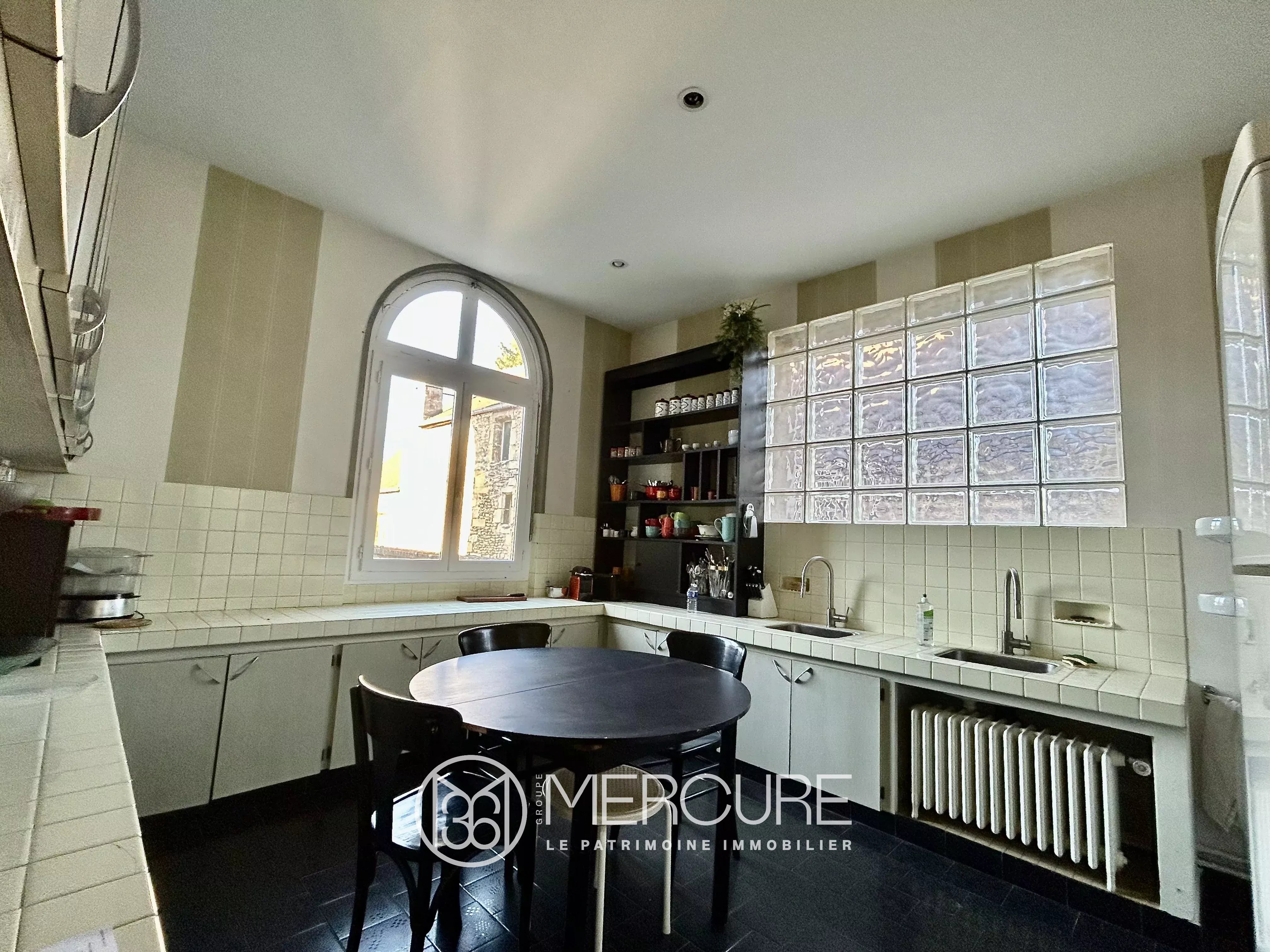 – On the left the large and luminous kitchen with two windows and its large work surfaces all around. Its central location in the house gives it an opening on all the reception rooms.