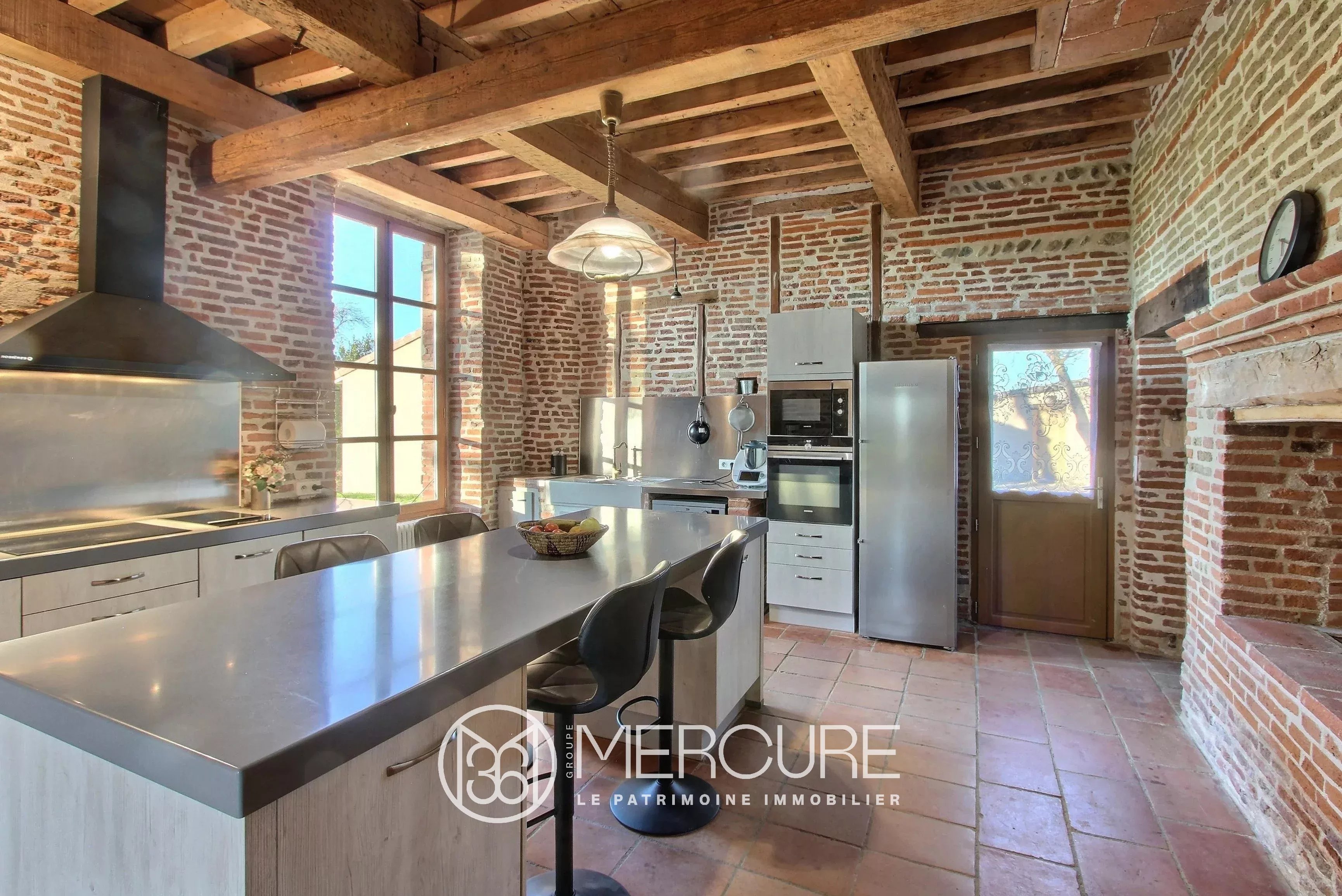The bright ground floor houses the reception rooms, and the 1st floor the bedrooms and bathrooms. Architectural features include brickwork, beams, terracotta floor tiles and fireplaces.