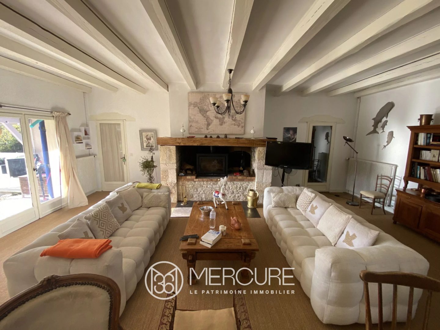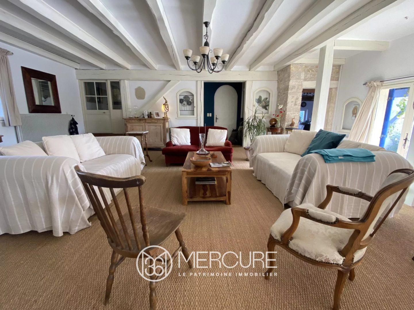 – Living room (84.5 m²), with large French windows, sea rush floor, stone fireplace with wood burner