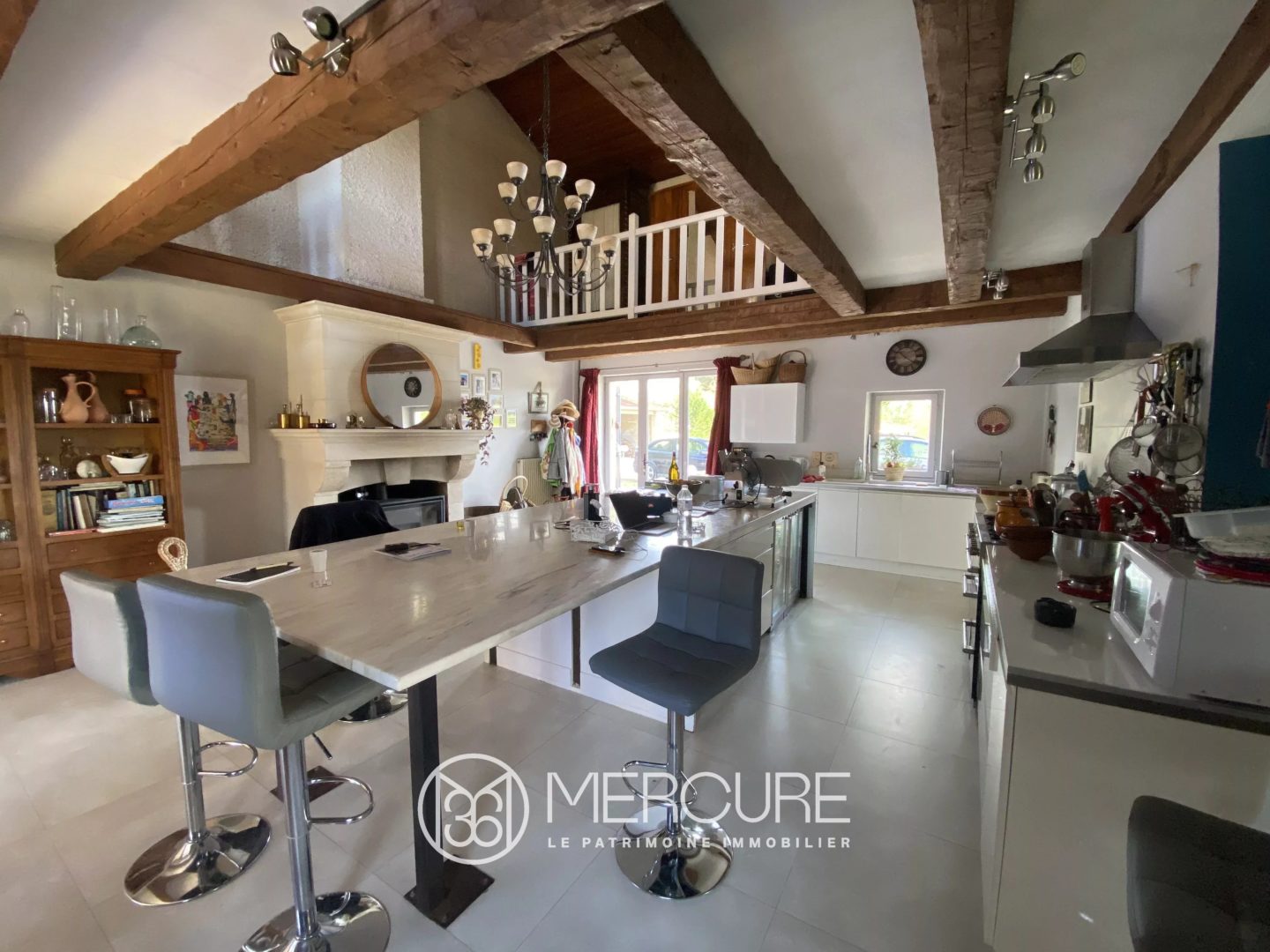 – Large, bright, fully-equipped kitchen with central island (44.4 m²), stone fireplace with wood burner, dining area