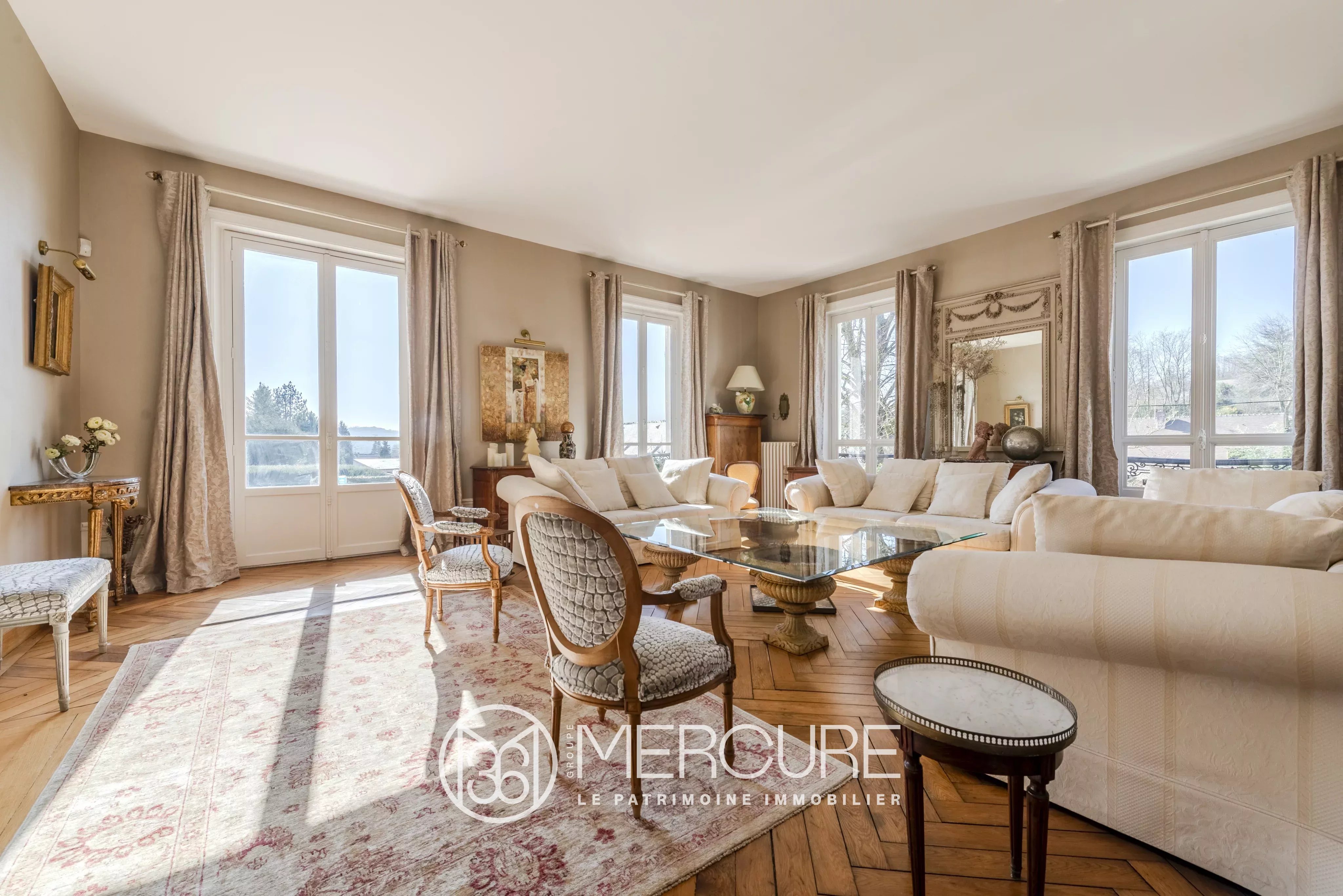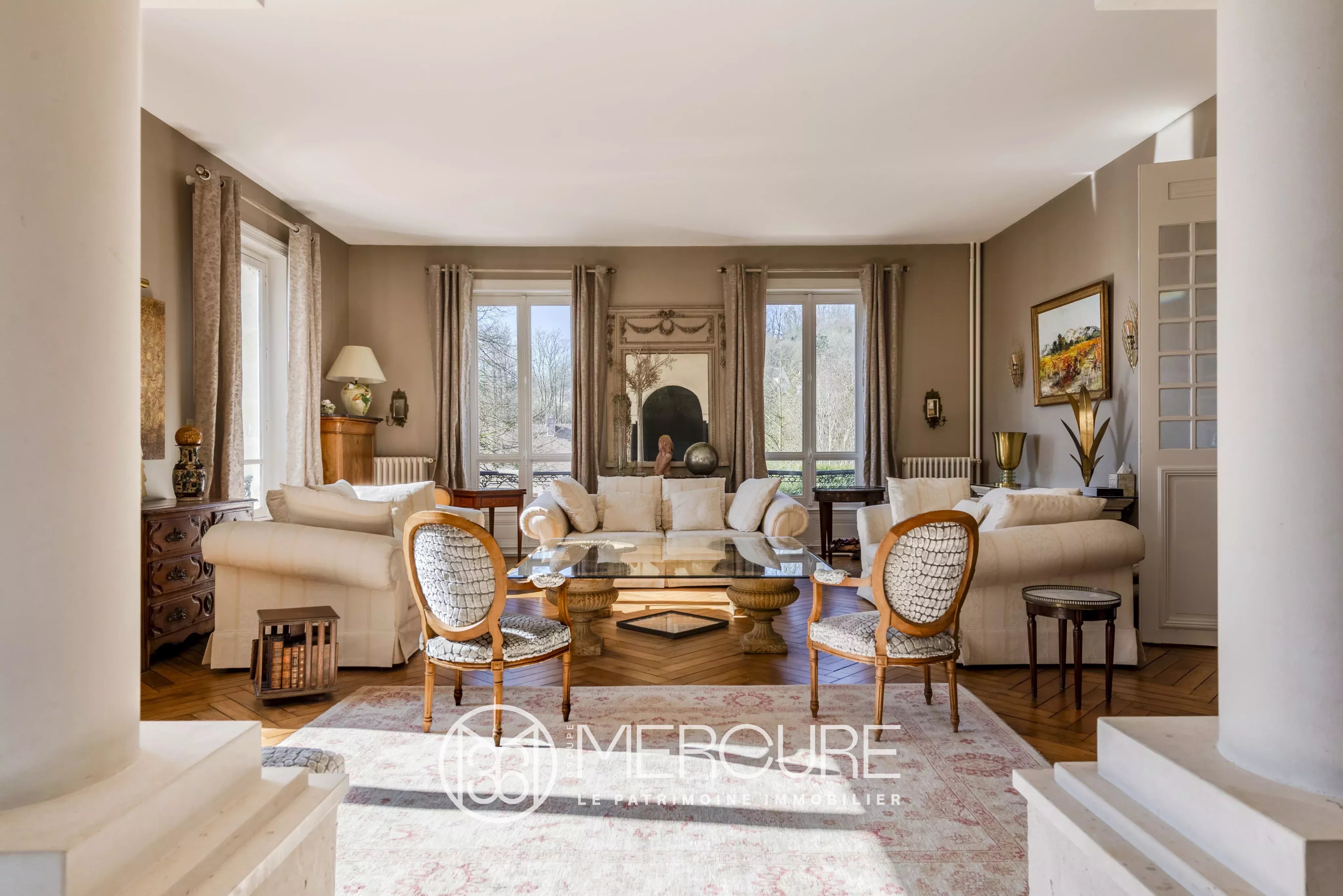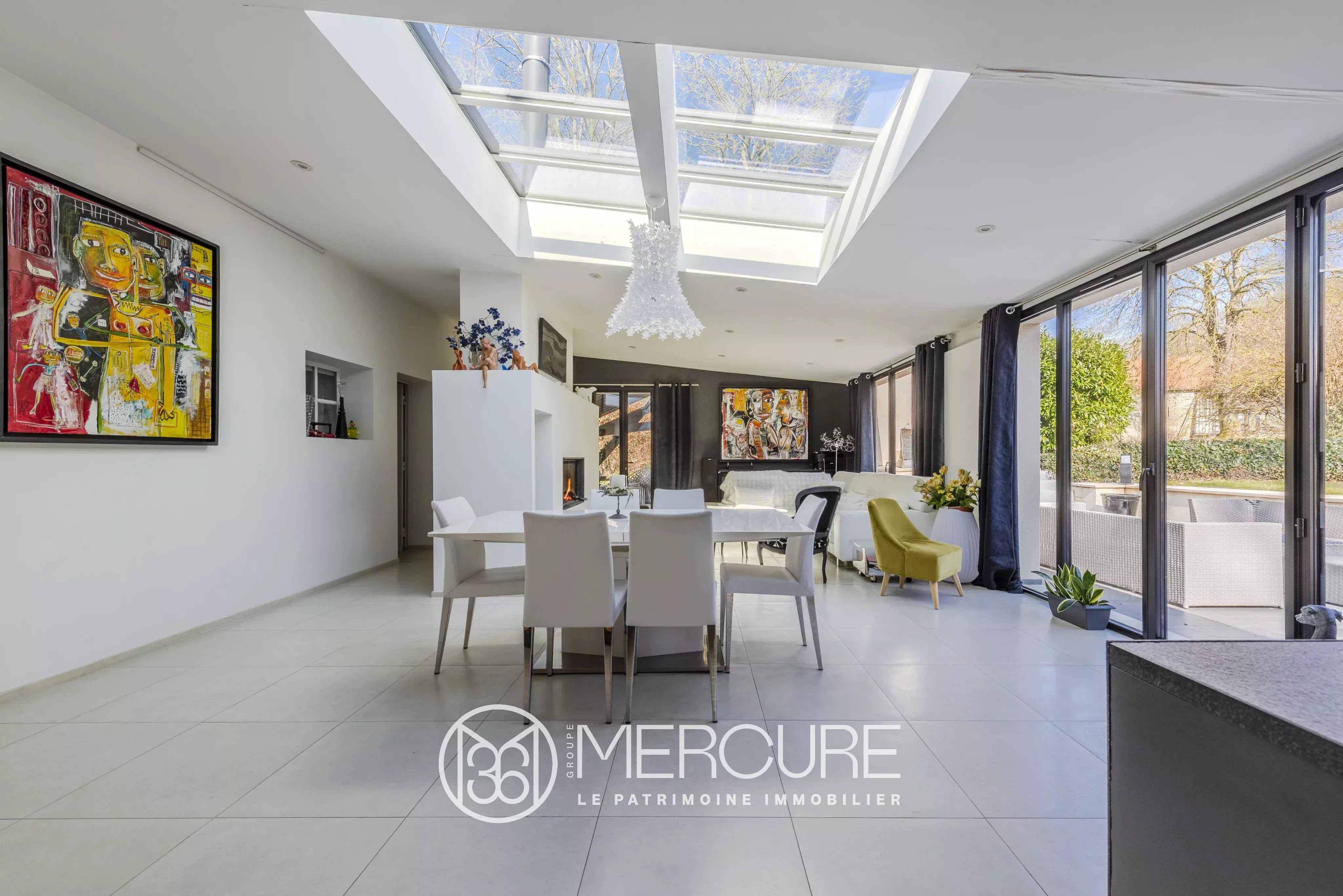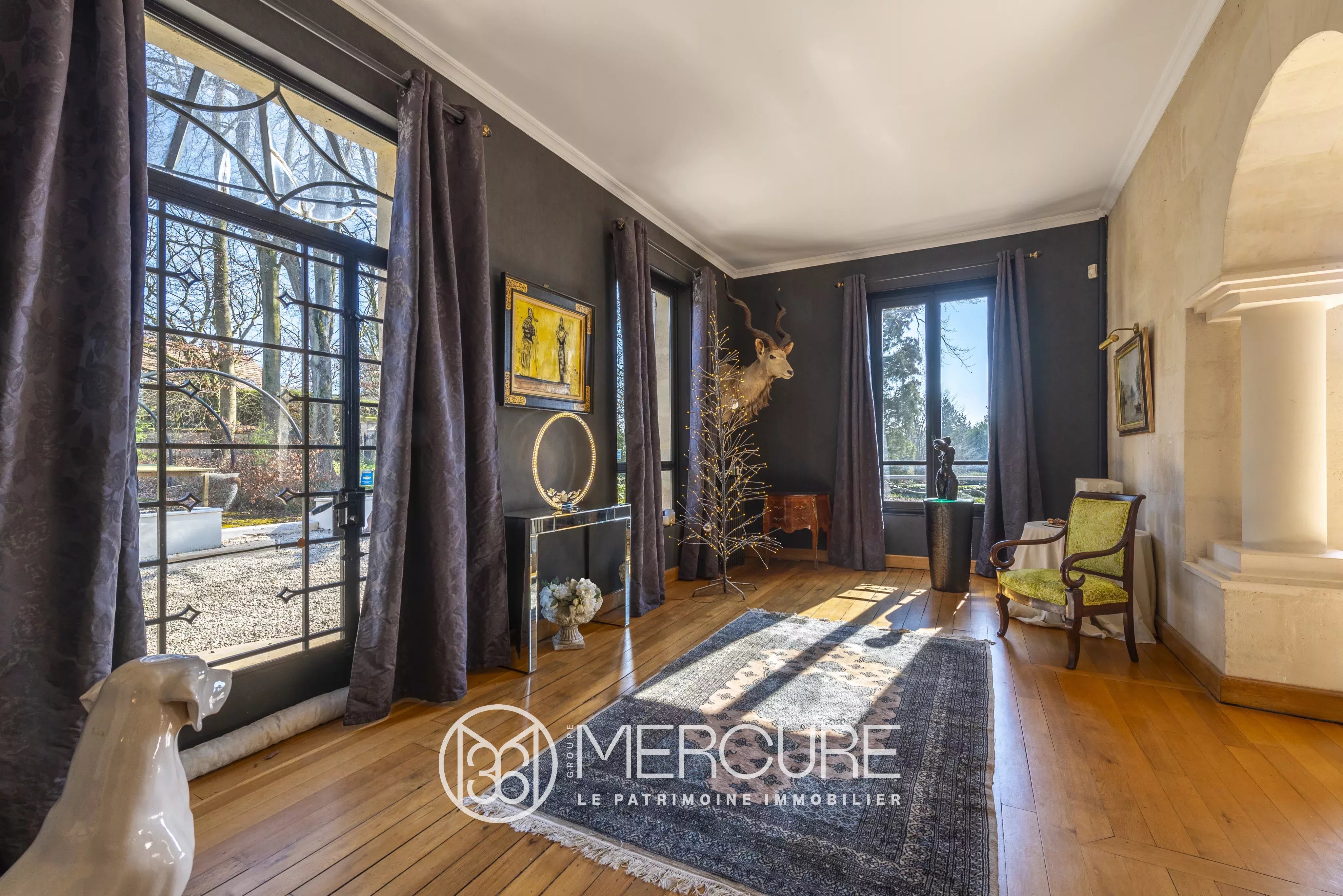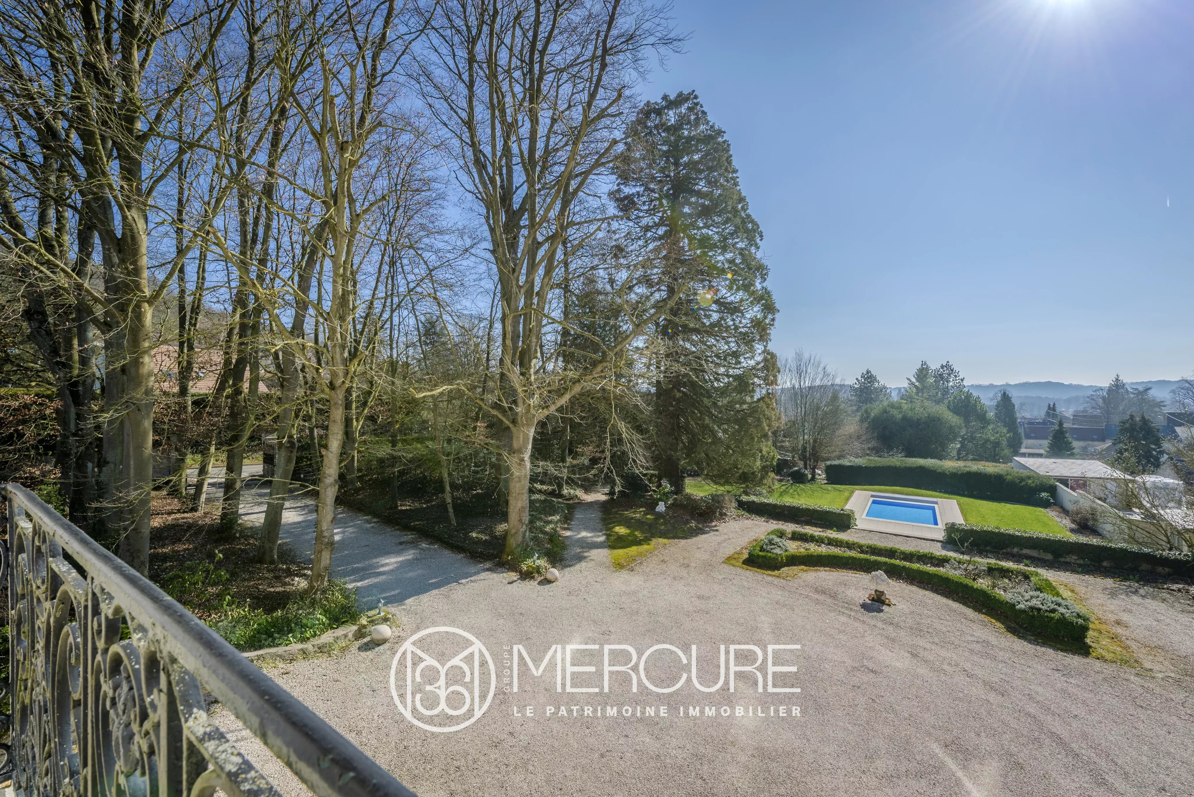 Elegant stone residence extended by a contemporary extension. With its south-facing aspect and panoramic views, it offers approx. 465m² of living space and 14 main rooms.