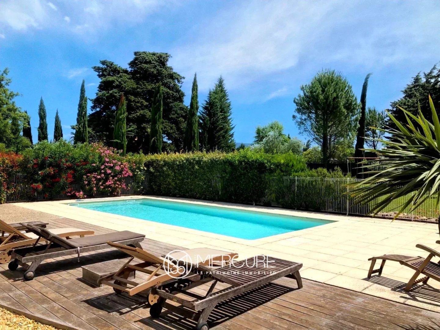 The 6,000 sqm wooded park is a veritable oasis of greenery, creating a serene, soothing atmosphere. The secure swimming pool is the perfect place to relax. The nearby pool house, with its kitchen and dining area, lets you enjoy summer days in complete privacy.