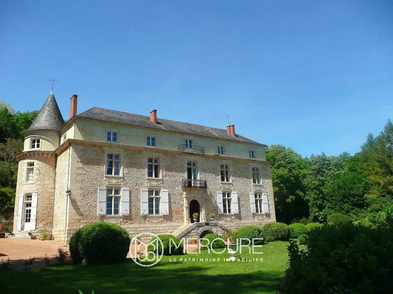 Near Périgueux, 16th and 18th century château flanked by two round towers on the edge of a 16 ha estate on a wooded slope, with a 2 ha park with boxwood and rose bushes on the terrace and meadows on 3 ha.