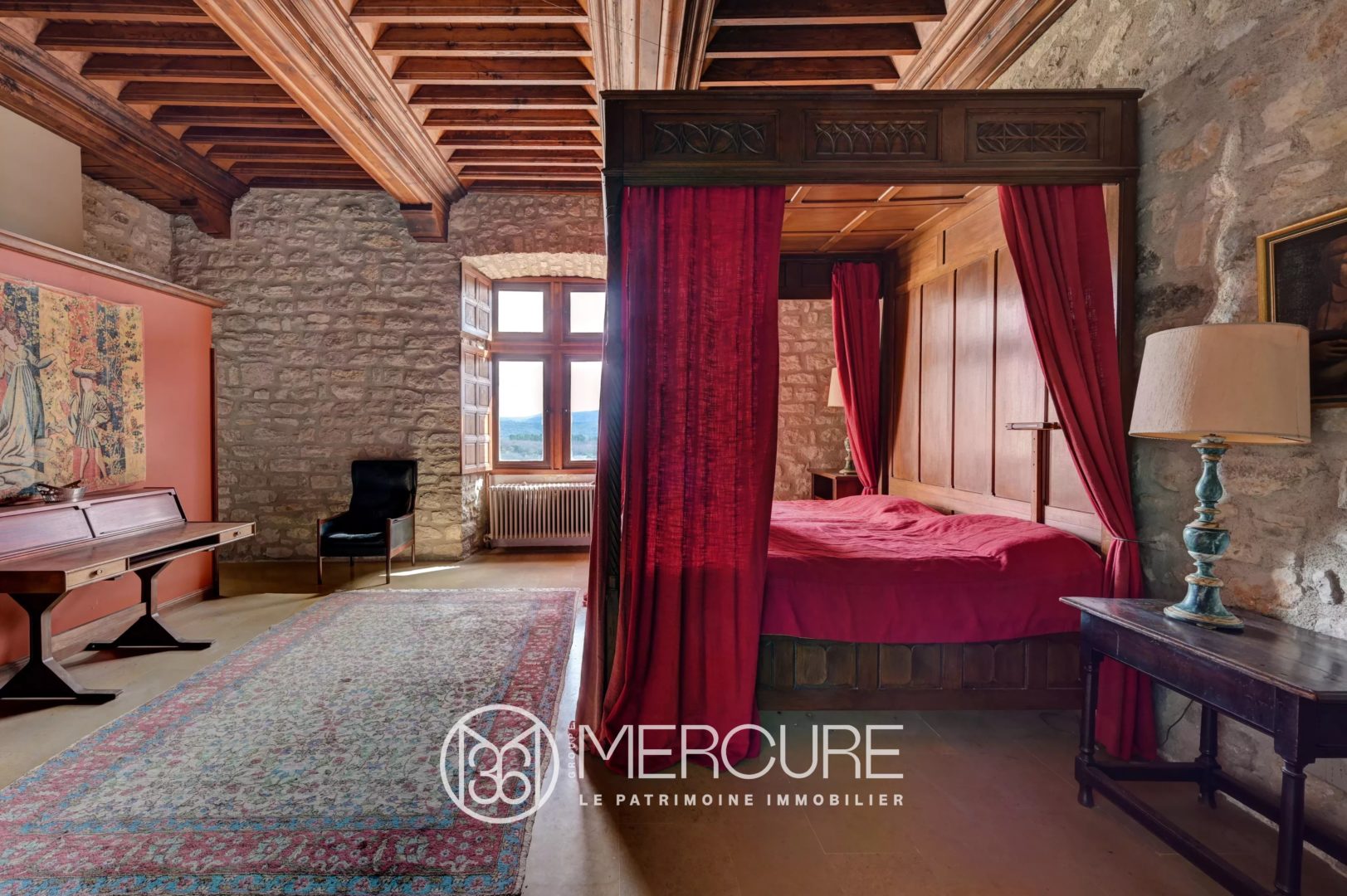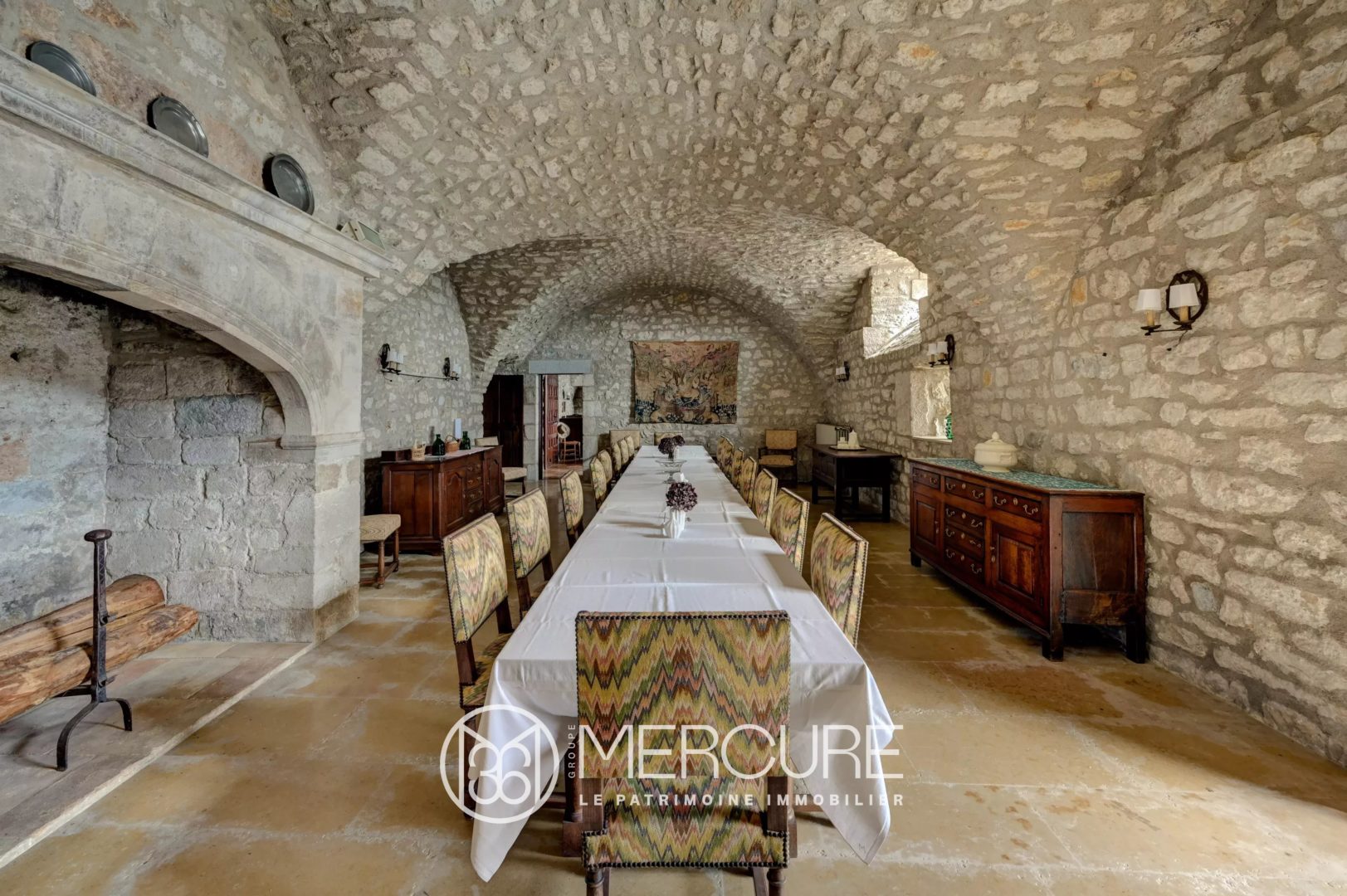 In addition to the château’s former boiler room, it has an intermediate room accessible from the “pluvarium”, from which a very narrow stone staircase leads to a bedroom and a terrace at the top.
