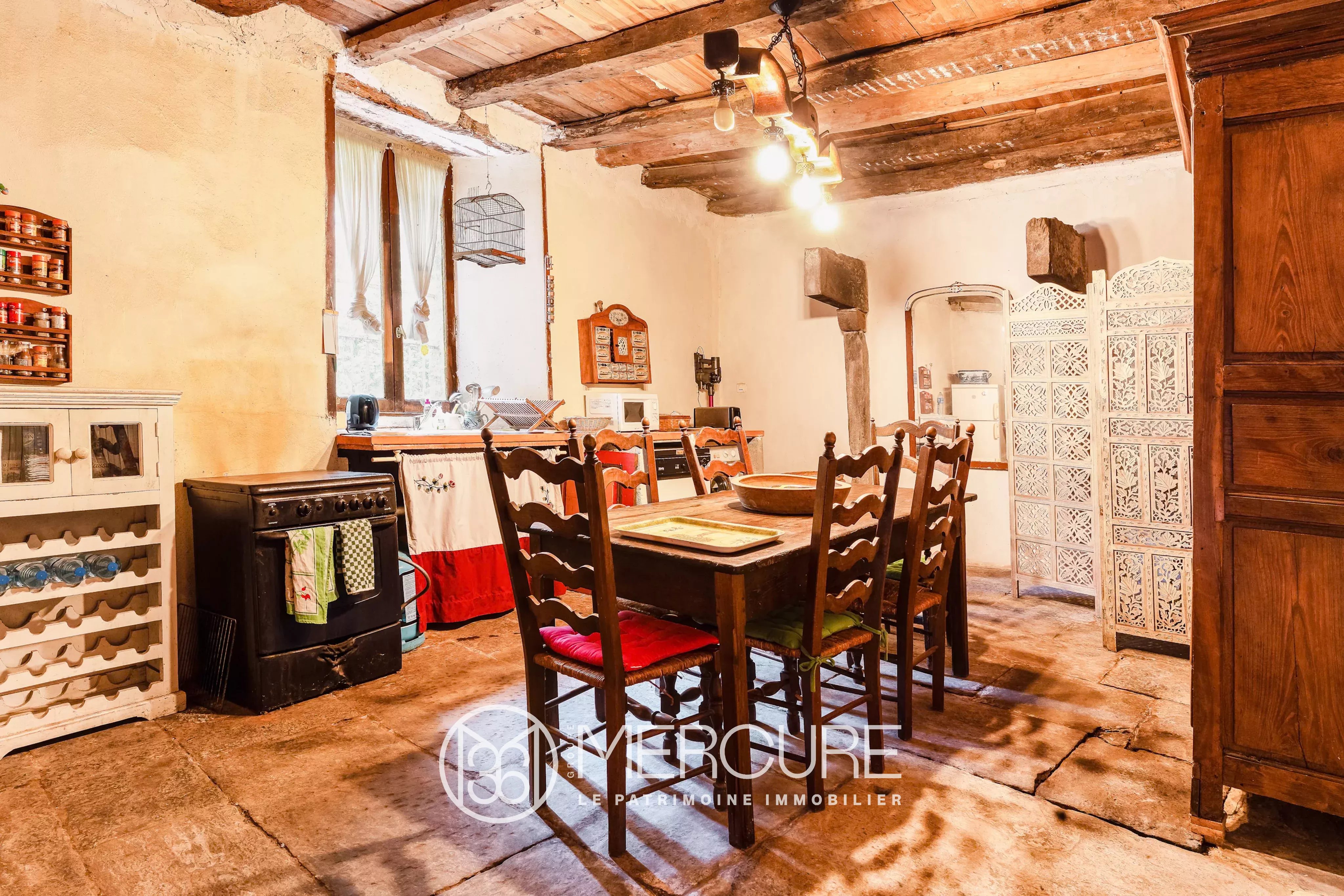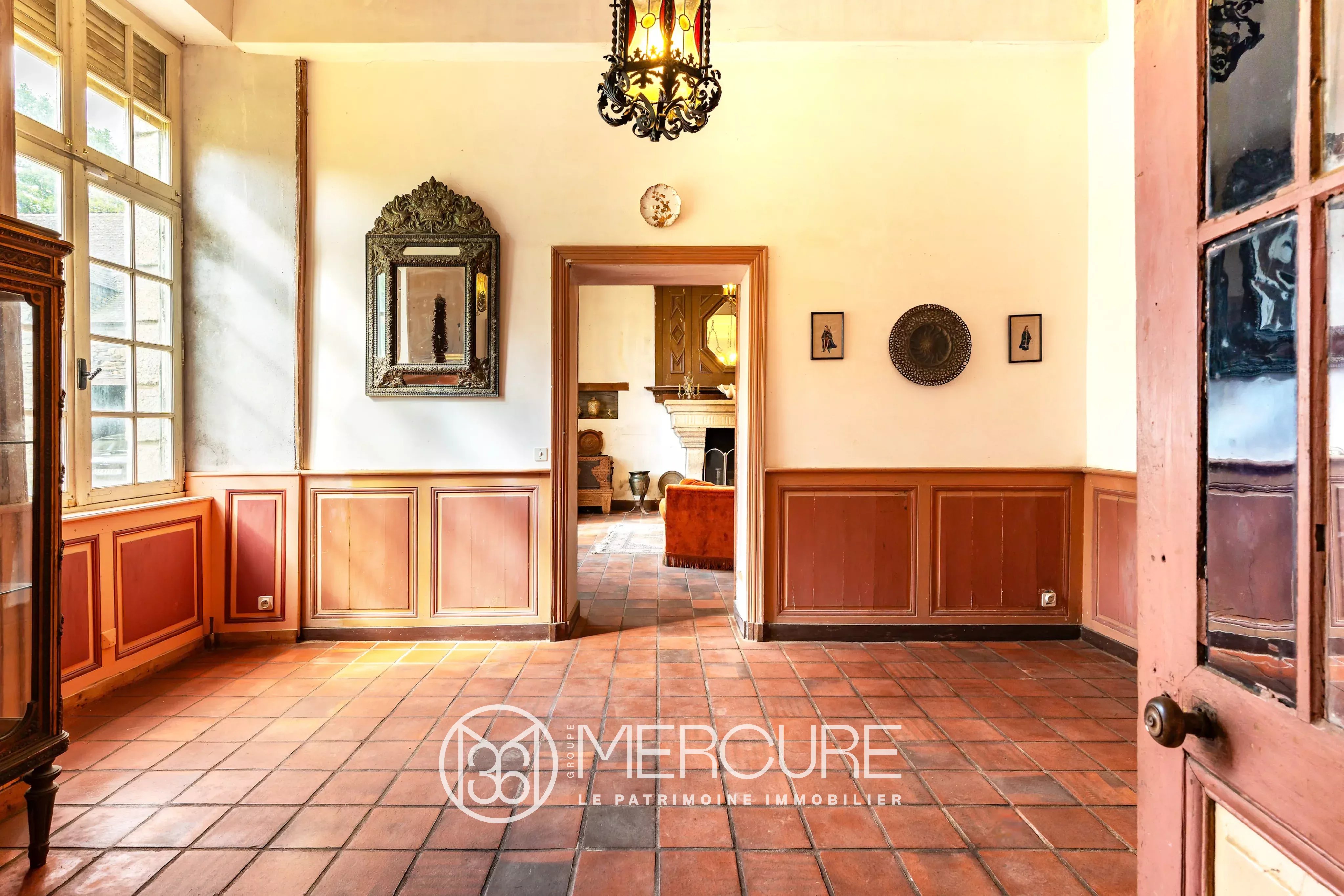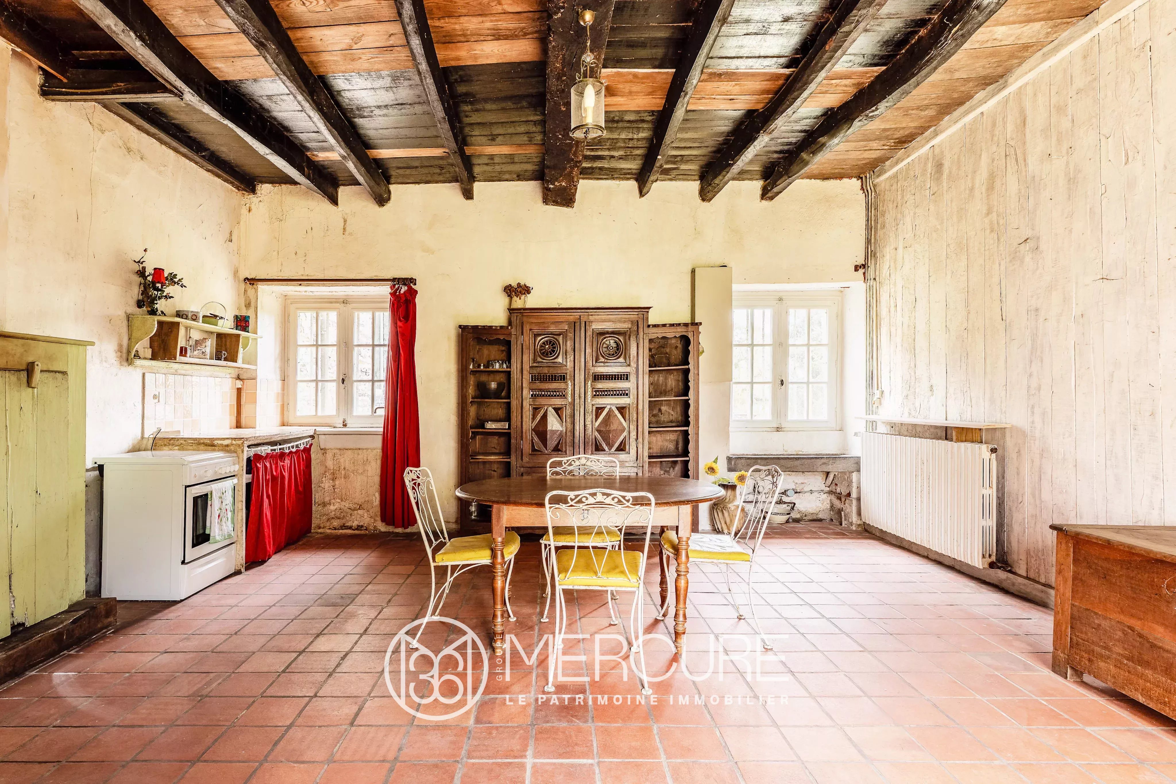 It features a vast entrance hall that leads, on the right, to a period dining room with terracotta floor tiles, a monumental schist fireplace and a wood-burning stove.