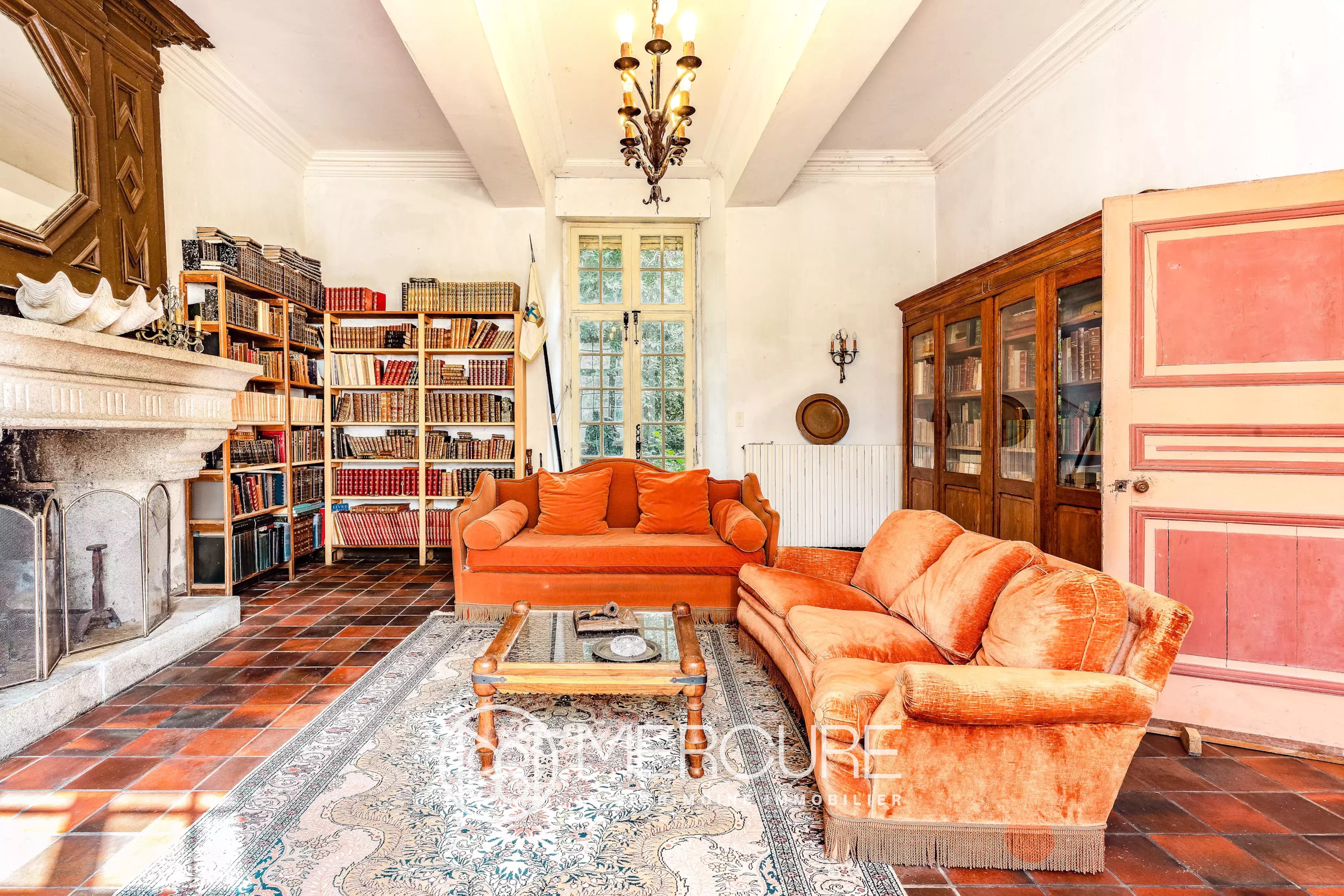To the left of the entrance hall, we enter a small living room with terracotta floor tiles adjoining a large library room with a monumental fireplace.