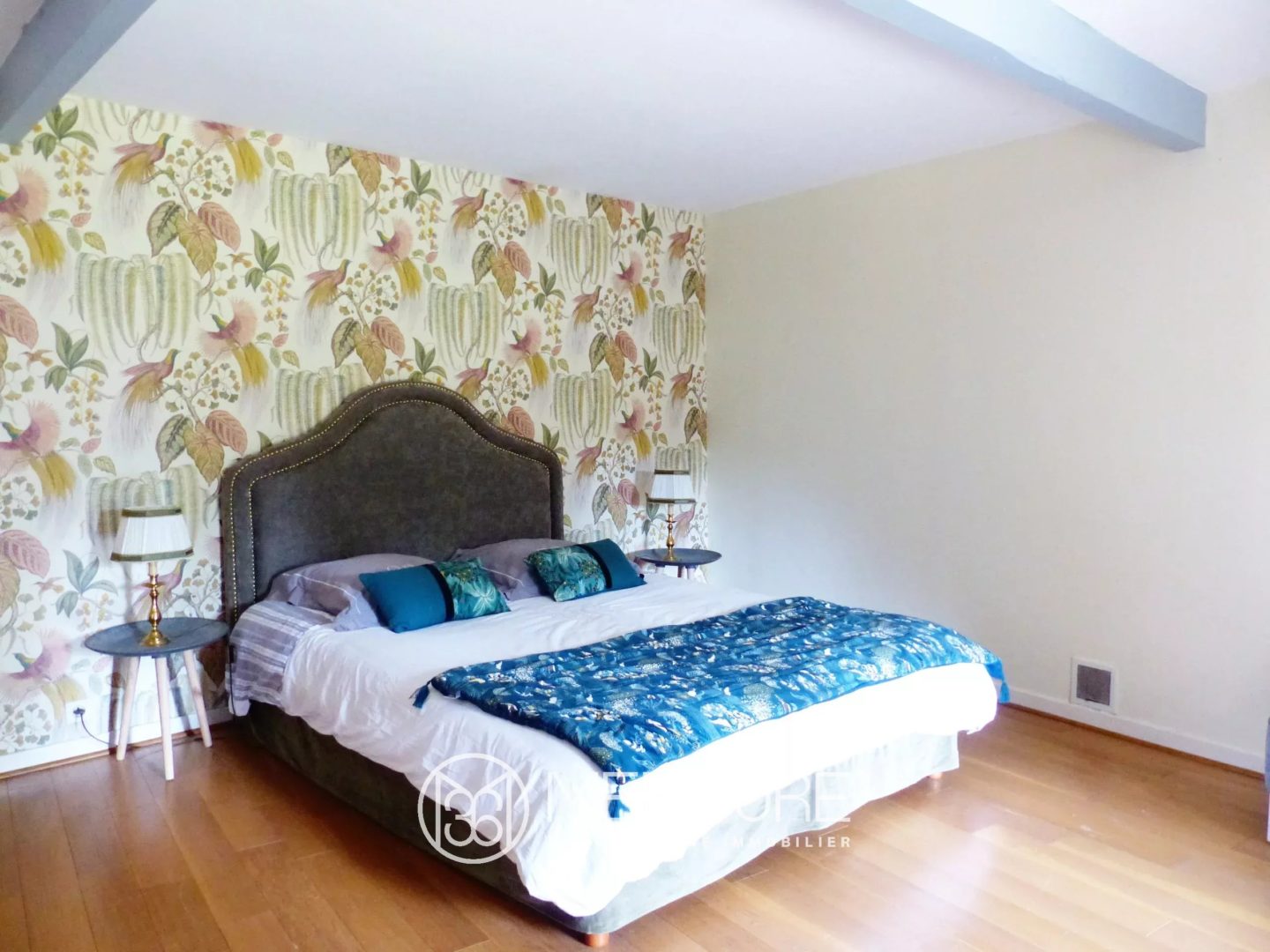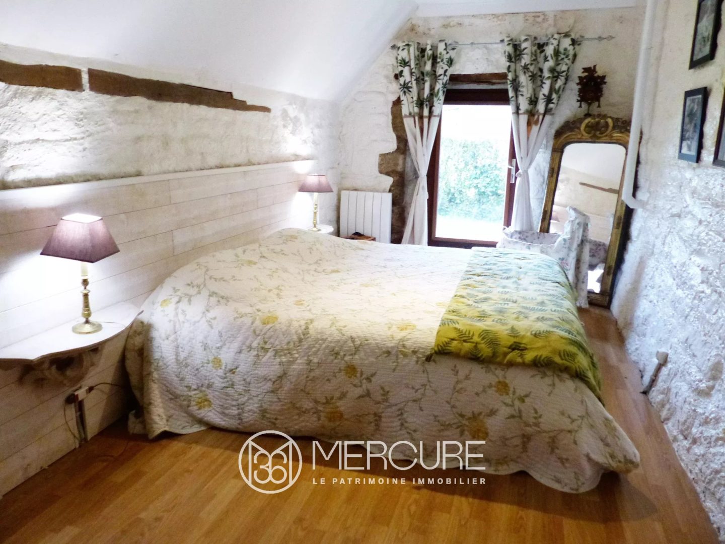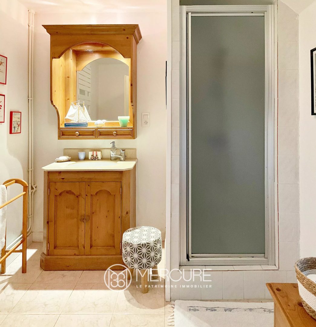 On the first floor, accessed by a splendid staircase with traditional wooden steps, a vast mezzanine/hallway leads to a group of four beautiful bedrooms, one of which is a “cathedral” with access via a deurgail to the ground floor terrace, a shower room with toilet. A bathroom with pretty “bateau” flooring completes the ensemble, as does a smaller staircase leading to a children’s bedroom under the rafters on the upper floor.