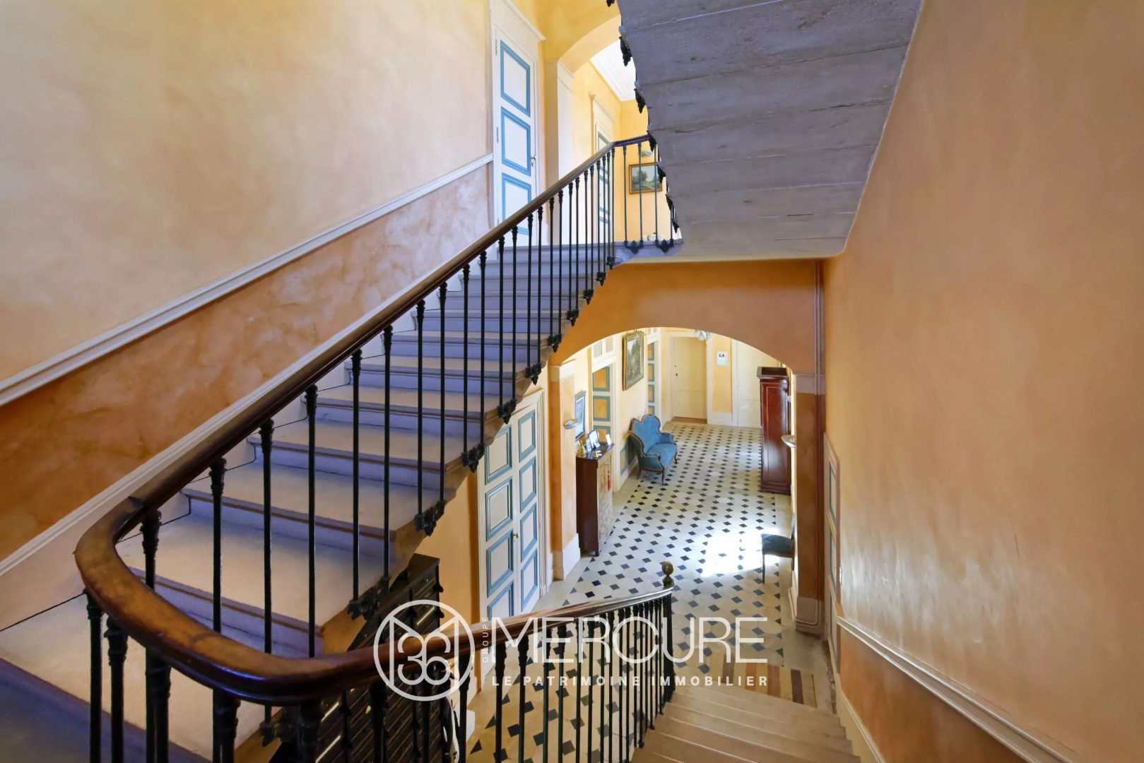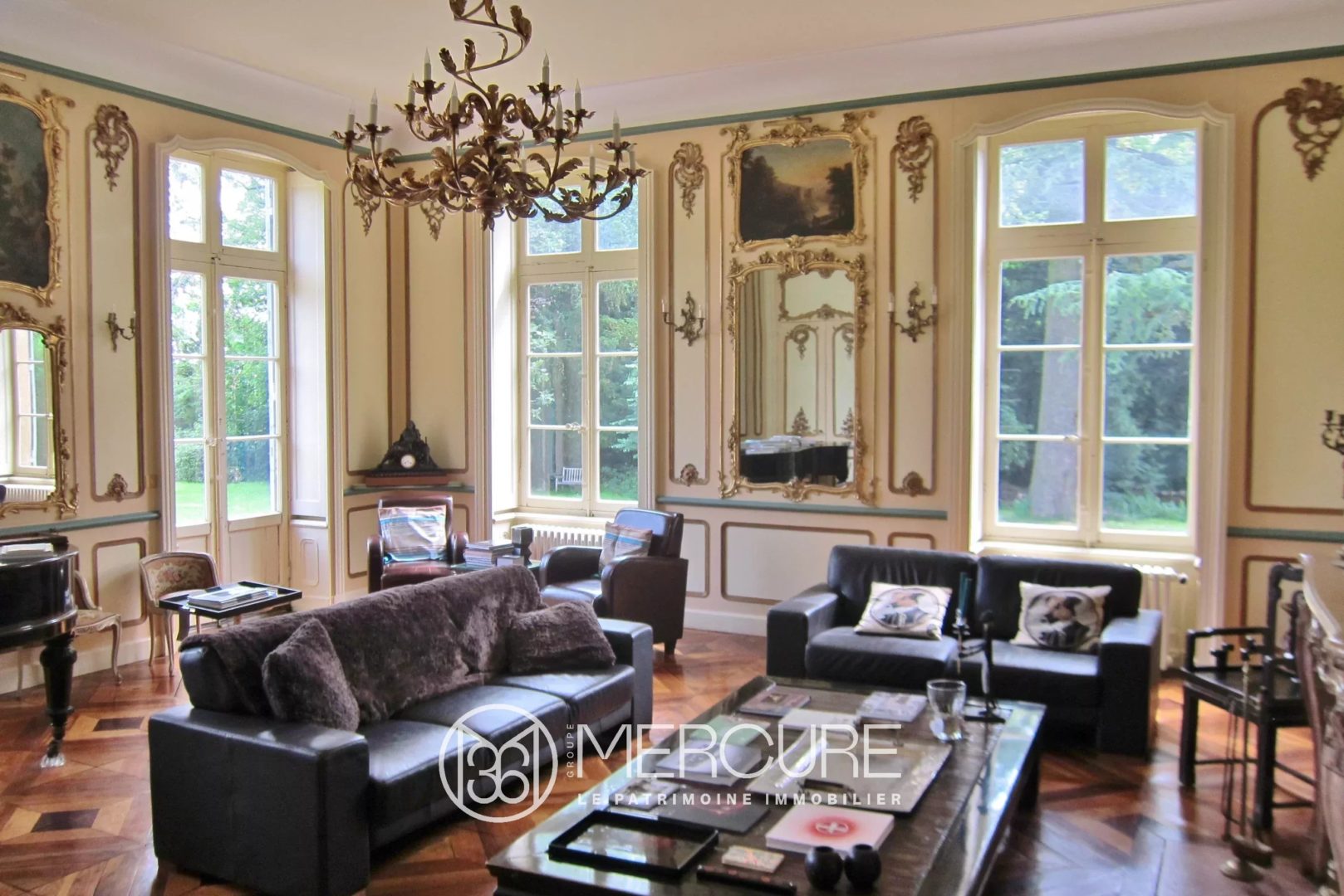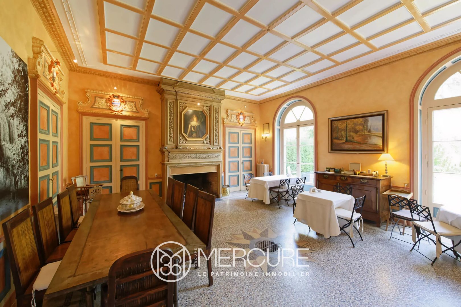 Beautiful receptions with fireplaces, wood paneling, inlaid parquet floors.