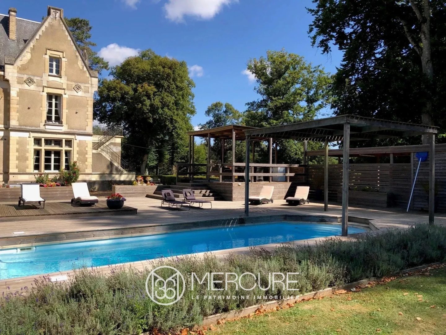 Au cœur du jardin se trouve la piscine : une terrasse surélevée accueillant un bassin de 10 mètres, une cuisine d’été, des toilettes, une douche et un carport attenant.
