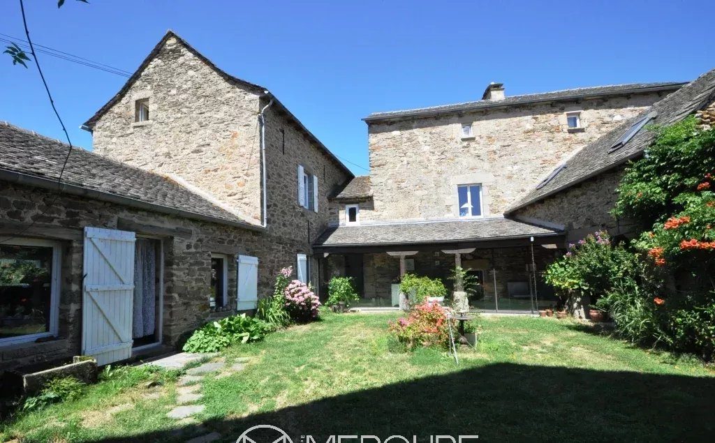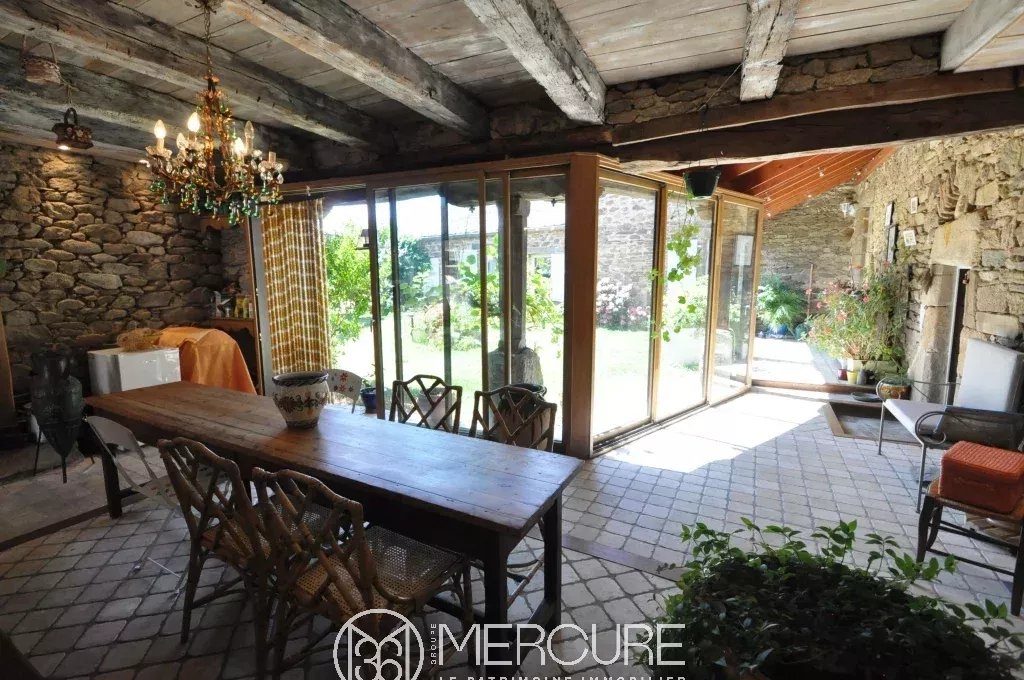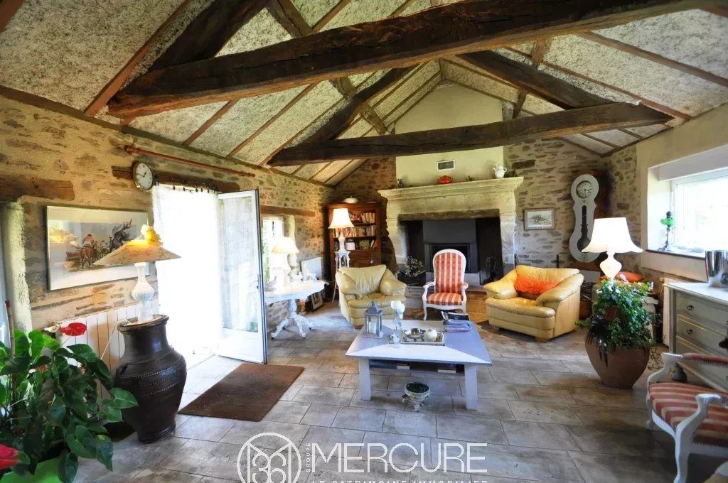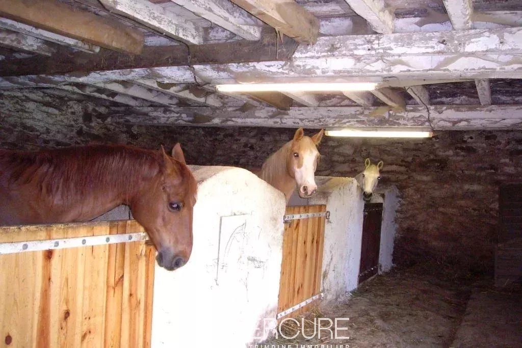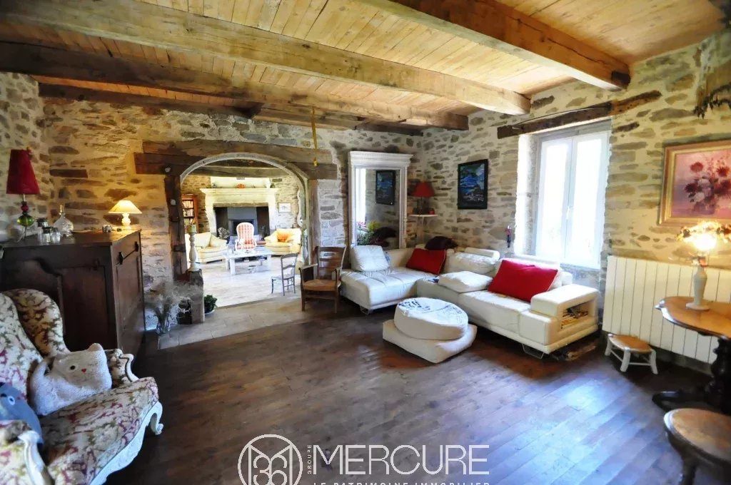 Around a courtyard, three stone buildings with slate roofs in a hamlet in the countryside. Main house of 400 m², house of 150 m², outbuilding of 430 m². Land of 1.8 ha with meadows, vegetable garden, orchard, spring.House of 150m² (gas central heating, underground tank) divided into two independent housings which could be used as cottages or guest rooms. Each has a bathroom and toilet.Main house of 400 m² (oil central heating and monumental fireplace with insert)Ground floor: – Double living room with fireplace / library of 70 m²- Reception dining room in vaulted room of 60 m²- Large kitchen and scullery- Conservatory of 50 m²- Terrace 20 m²1st level:- 3 bedrooms, one of 60 m²- Bathroom- Shower room- Toilet2nd floor :60 m² bedroom with en-suite shower roomOutbuilding: barn with concrete slab and automatic gate, garage, sculpture workshop, stable with 4 box. Very beautiful frame. Two levels of 218 m² each.Close to all amenities.