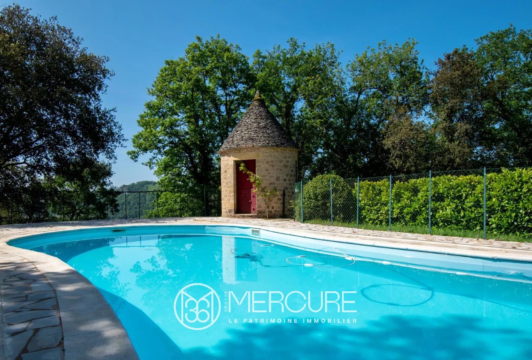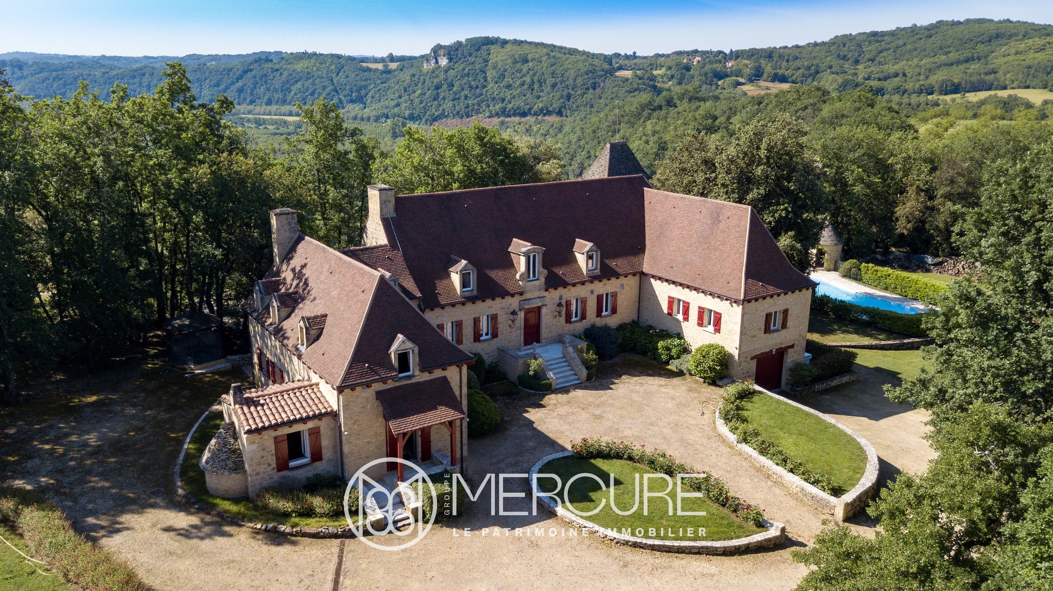 This splendid property is overlooking the river Dordogne and its cliffs and offers exceptional panoramic views. The house insures excellent comfort and was built in the traditional manner of the region. From its shady terrace, you will enjoy the landscape and ancient villages of the Périgord, the cliffs and the serenity of the place. Inside, luxury services. On the ground floor, marble, beautiful ancient doors, stone fireplace, mezzanine, lift and en-suite bedrooms. A guest house is situated in the left wing, ideal for gites or for your guests. Heat pump heating system, double isolation, double and triple glazing, a full basement, 2 sheds and a magnificient pool overlooking the valley.