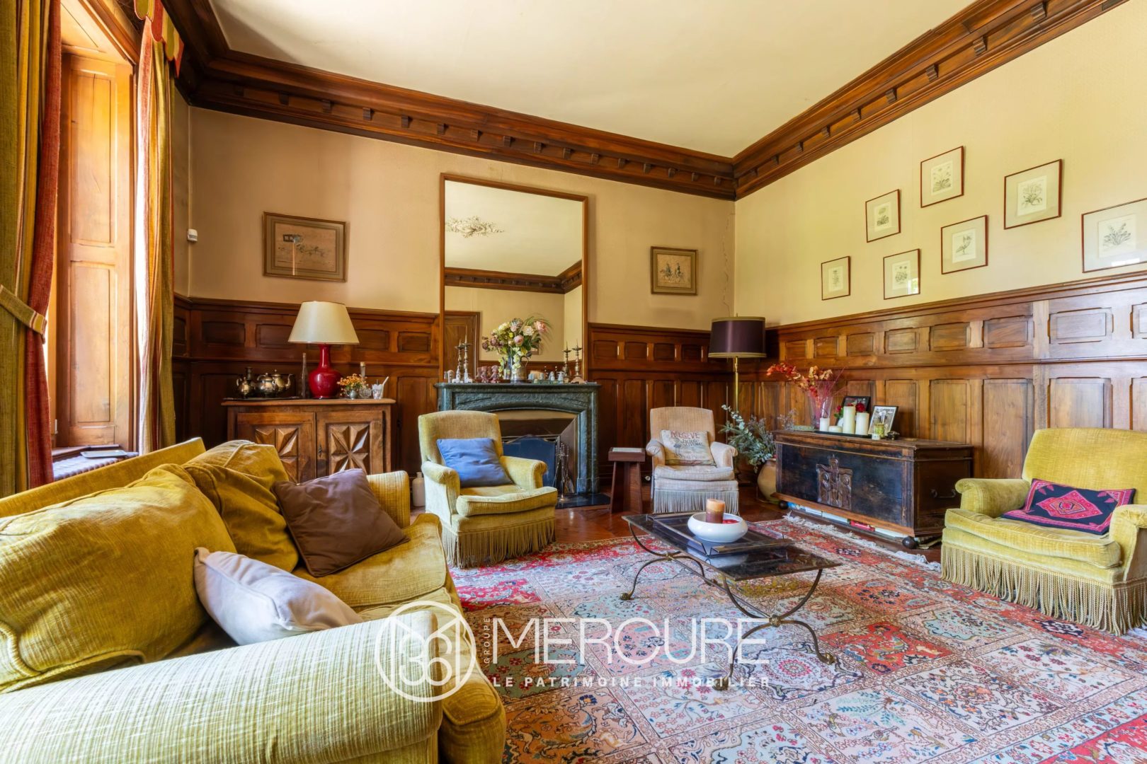 Ground floor: a through entrance leads to a lounge with wood panelling, a library overlooking the garden, a dining room and a kitchen. Toilets and access to the cellar.