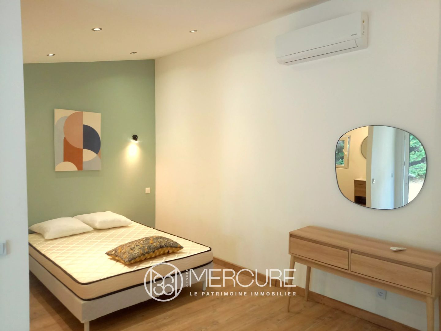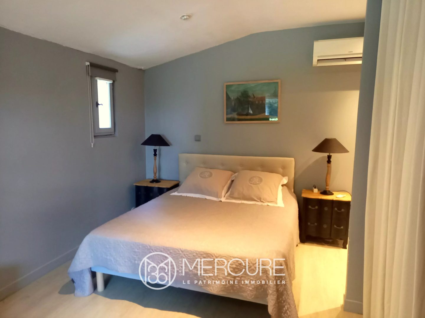 The entrance leads to a spacious living room with a cathedral ceiling of 53 m² with direct access to a small covered terrace. A fitted kitchen in a contemporary style also opens onto the grounds. Two further bedrooms, also facing south, one of which opens directly onto the garden. To the north, the master suite features a walk-in wardrobe, an en-suite shower room with toilet, and a further bedroom with a shower. A utility room and a toilet complete the ground floor.