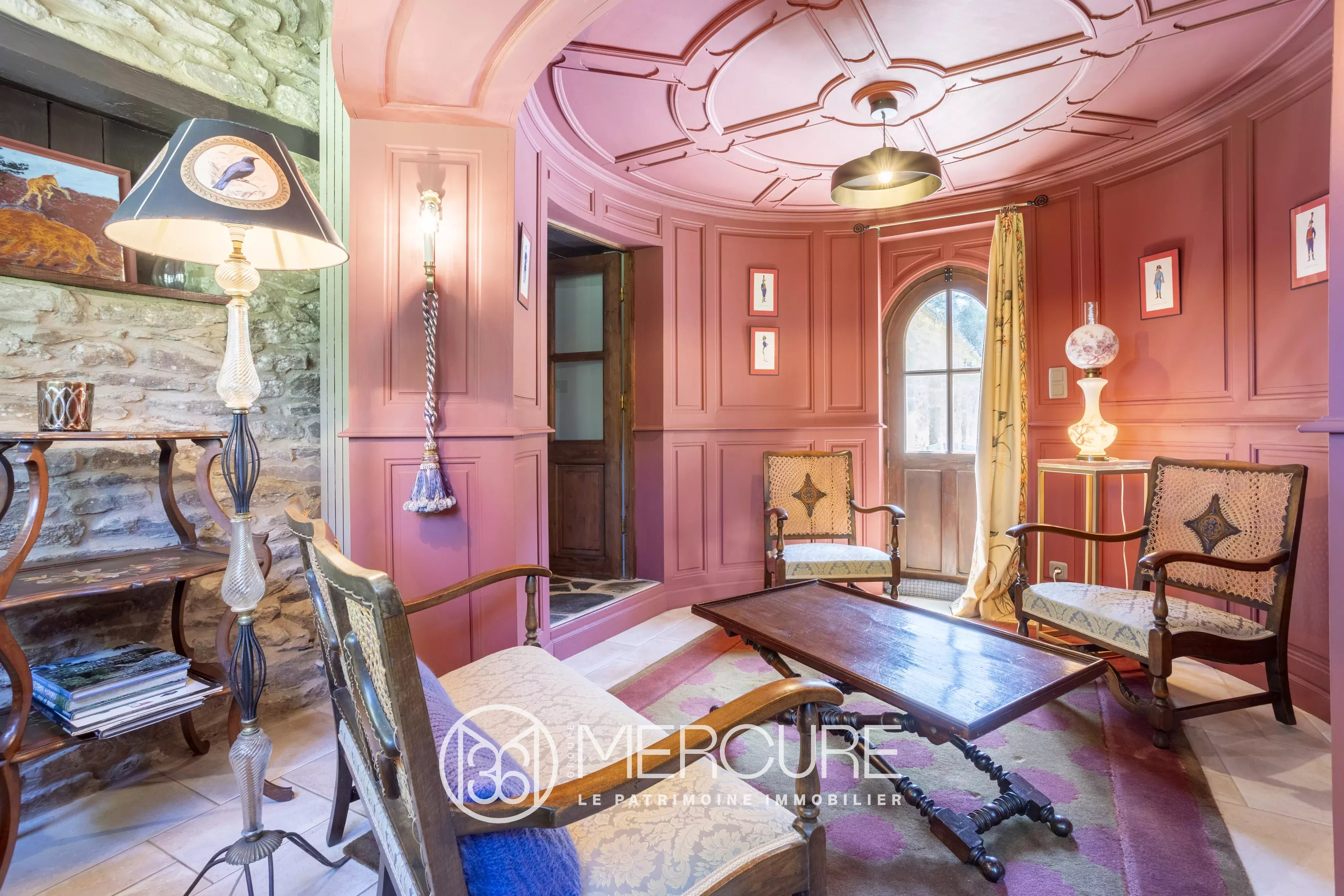 In the main section: a large lantern-style room of around 60 m² with a monumental fireplace, a fully equipped kitchen, a cozy library/sitting room, a round tower room, a bedroom with en-suite bathroom, and a separate toilet.