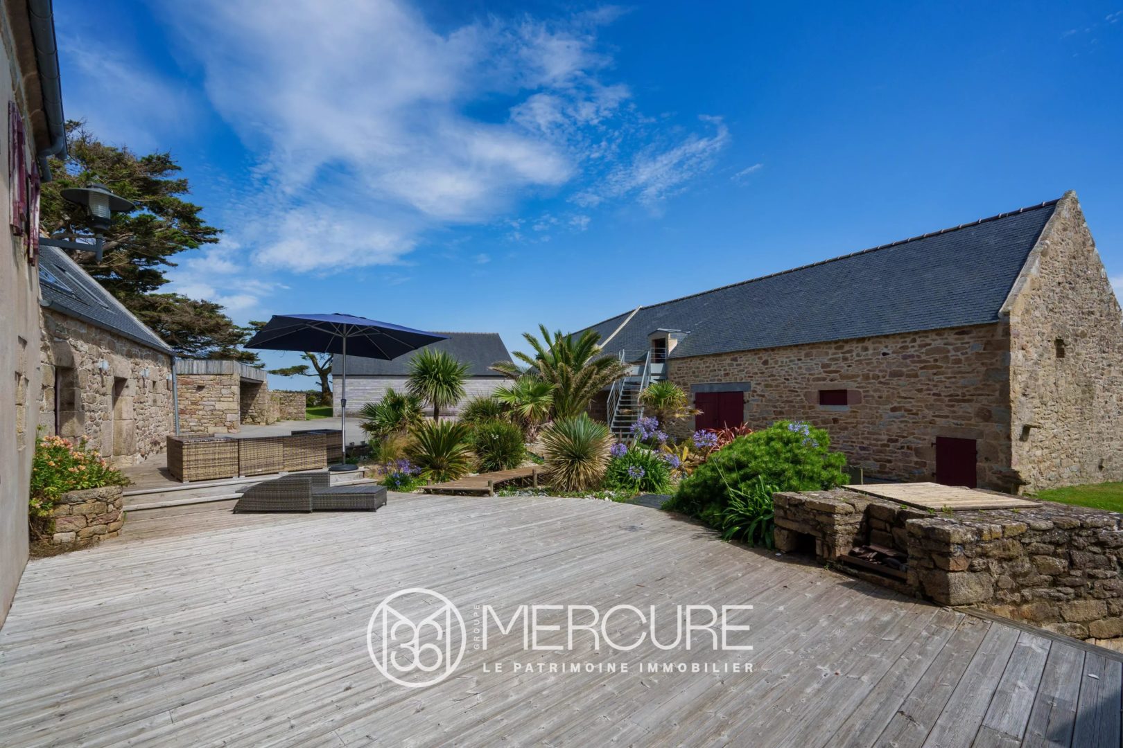 In the heart of a beautifully landscaped park of about 4,000 m², three superbly restored stone longères form a unique ensemble—authentic, timeless, and resolutely turned toward the sea. Stone, light, and wind intertwine here to tell the same story: that of a preserved and profoundly beautiful Brittany.