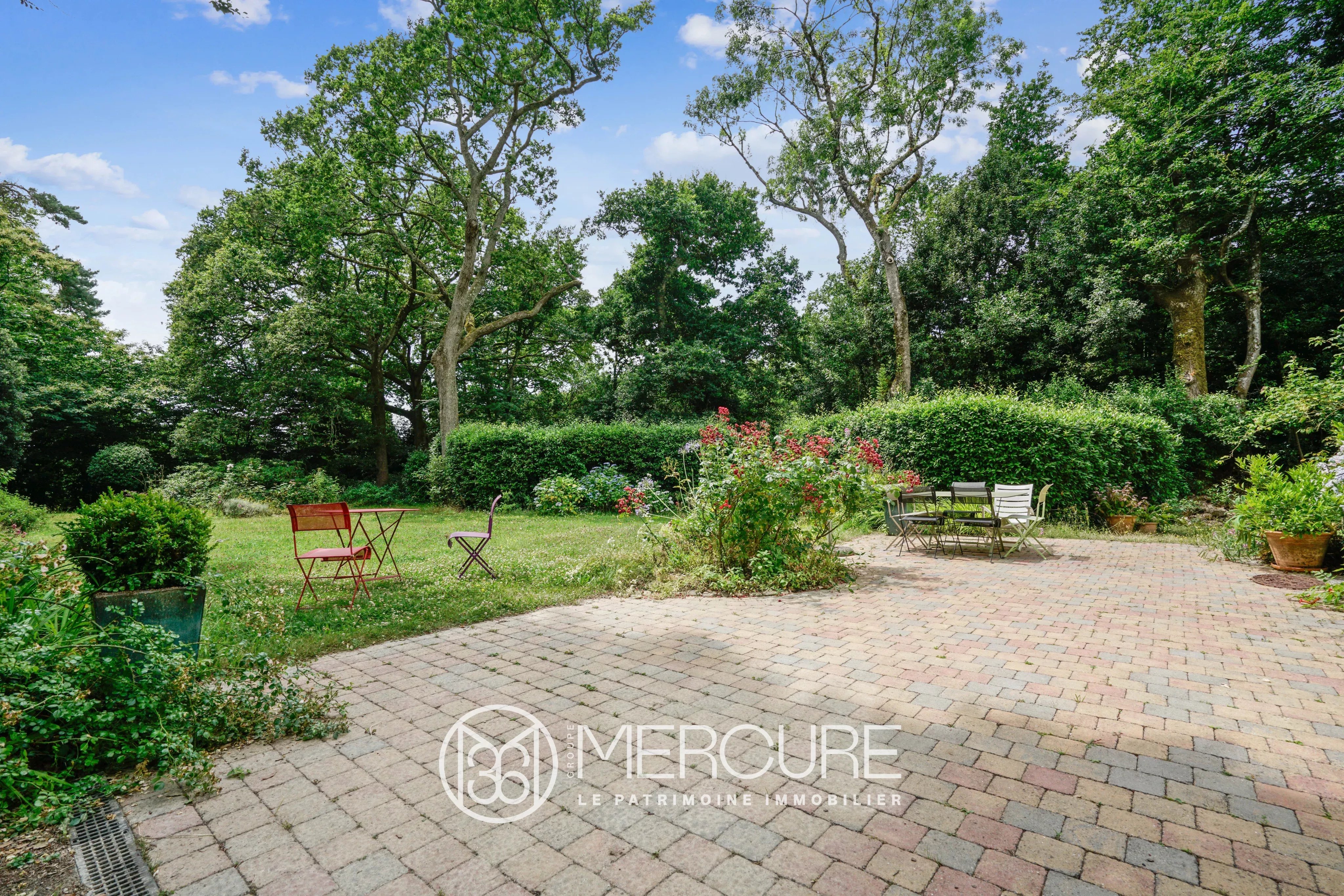 Sheltered from view by its natural wooded grounds, it offers a small sea view from the south-facing upper floors.