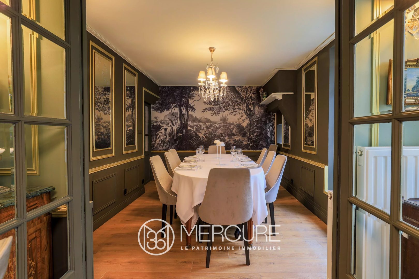 It comprises a main entrance hall, three spacious, beautifully renovated living rooms (34m², 35m² and 50m²), a more intimate dining room, ideal for a cozy atmosphere, as well as an office and two-entrance bathrooms.