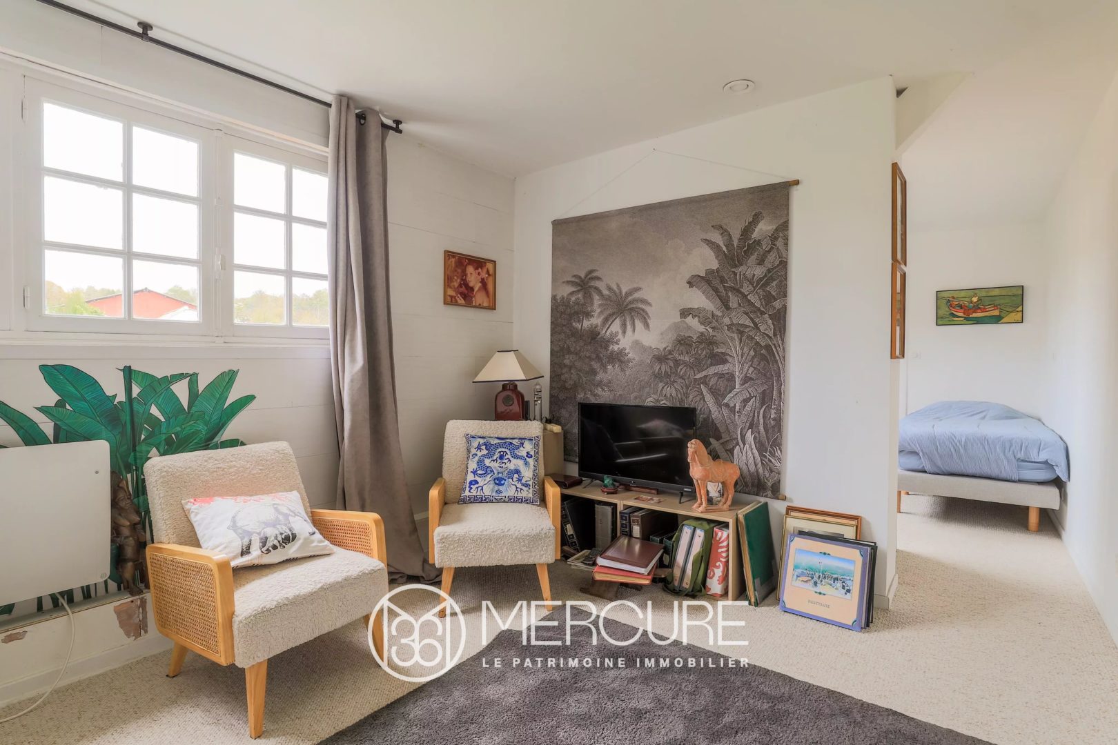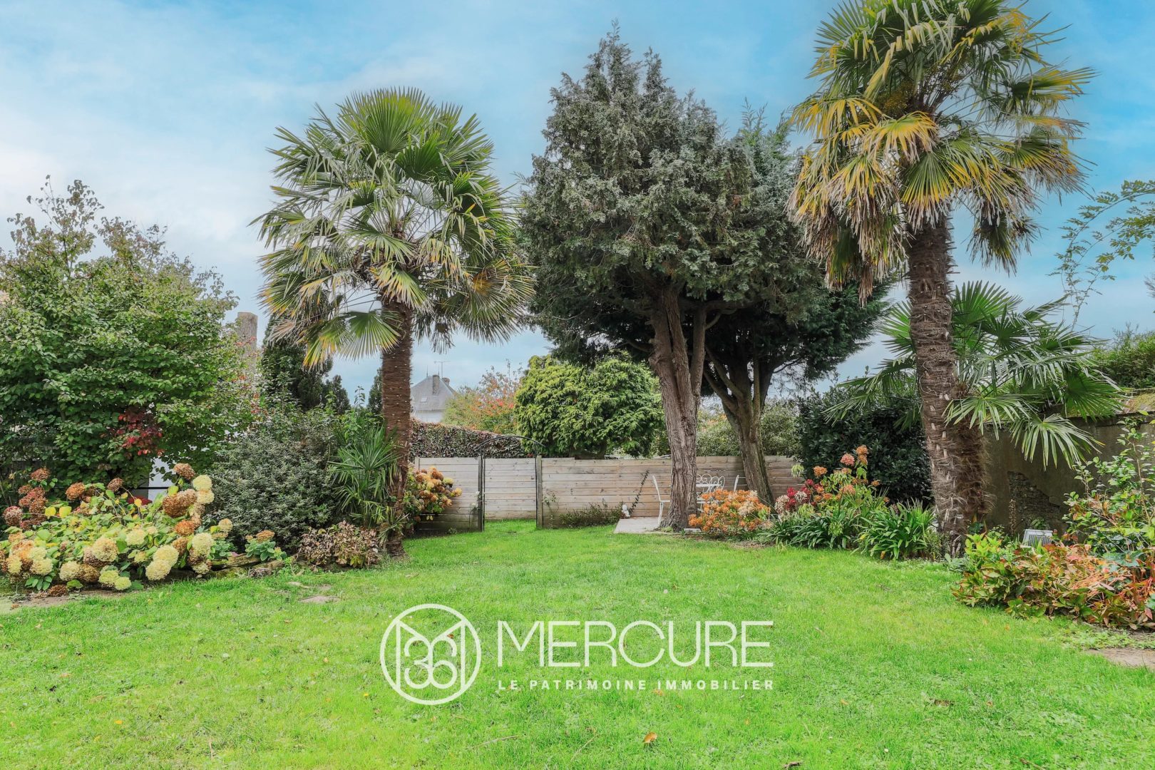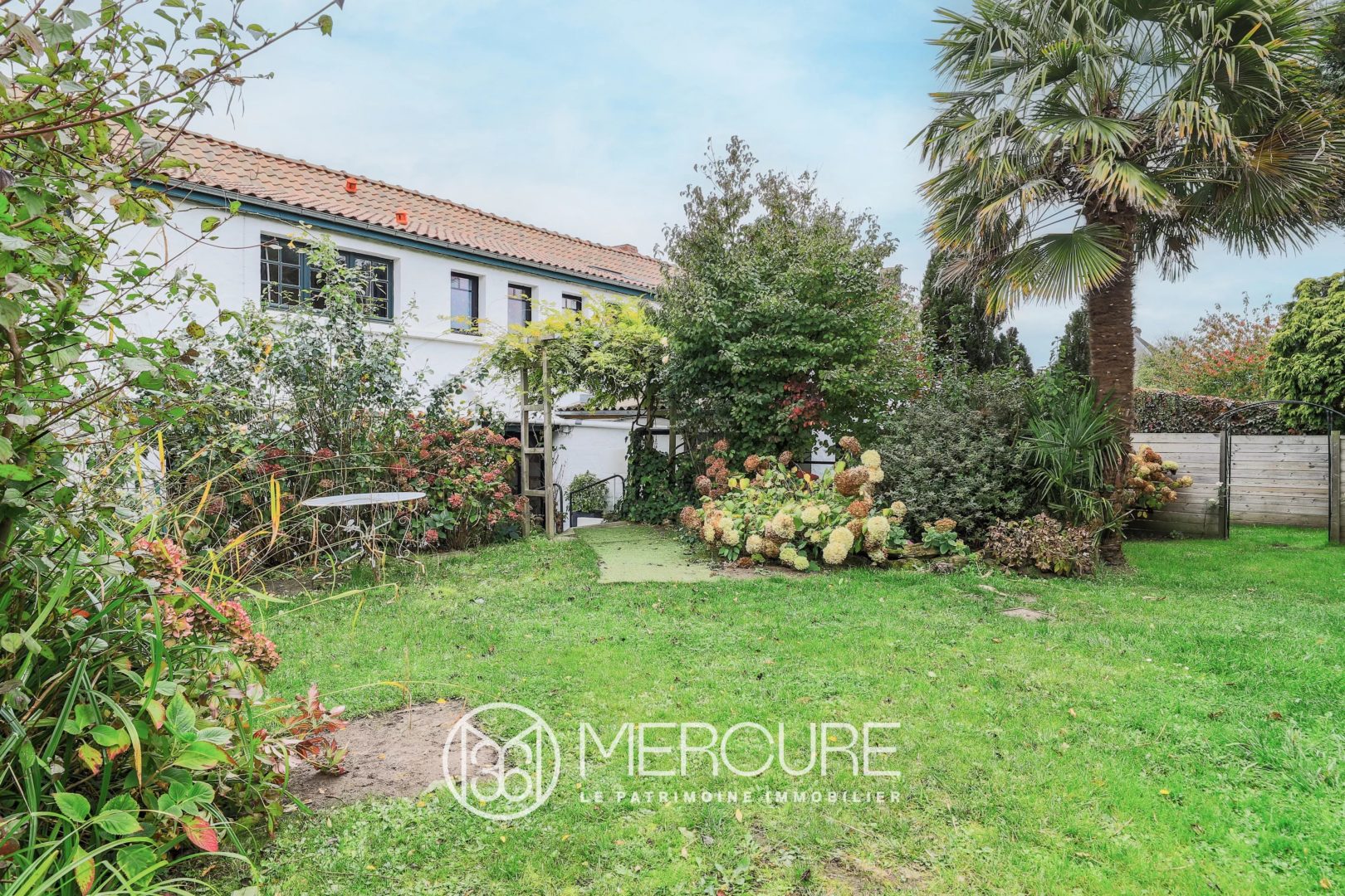 The enclosed garden, adorned with flowers and two palm trees, adds an unexpected touch of exoticism to this bucolic setting.