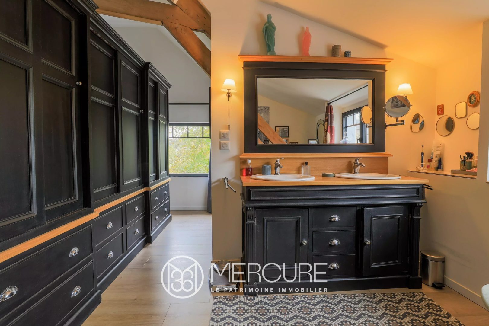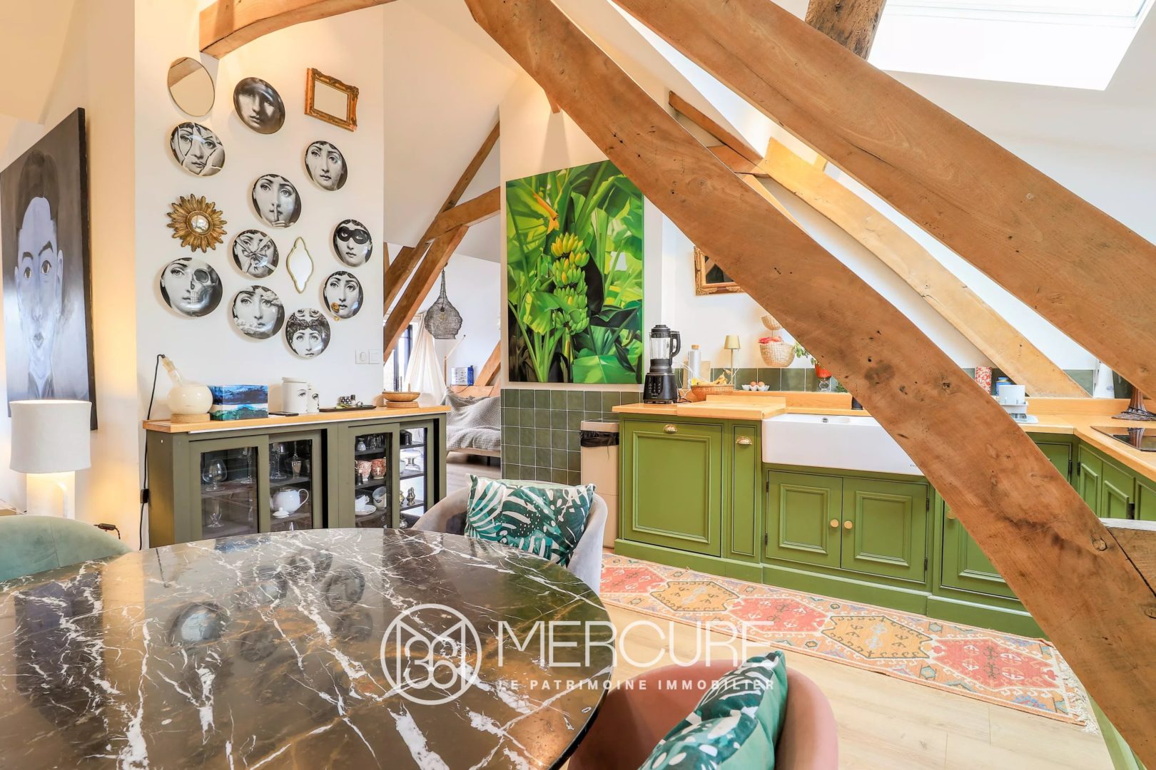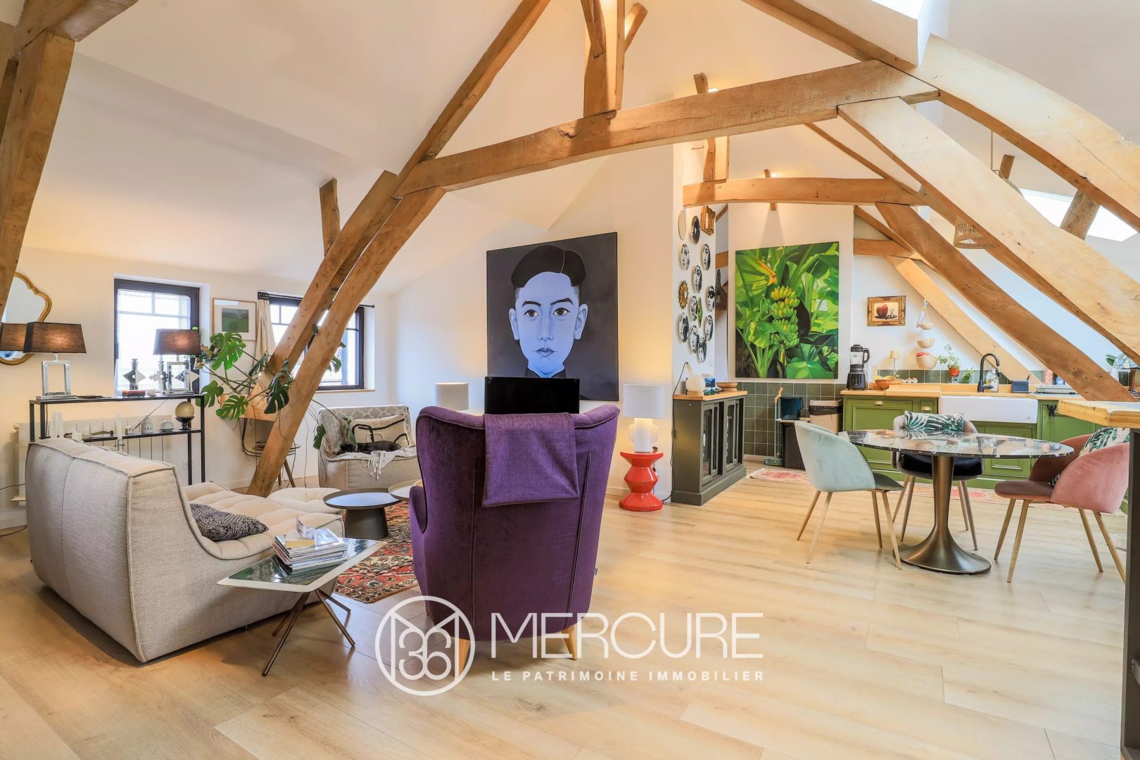 Upstairs, completely renovated, a magnificent 127m² apartment, with exposed beams, has a large living room, a fitted kitchen, storage space, a laundry room, a toilet, and a sleeping area consisting of a bedroom and a bathroom with a walk-in shower, carefully decorated and custom furnished.