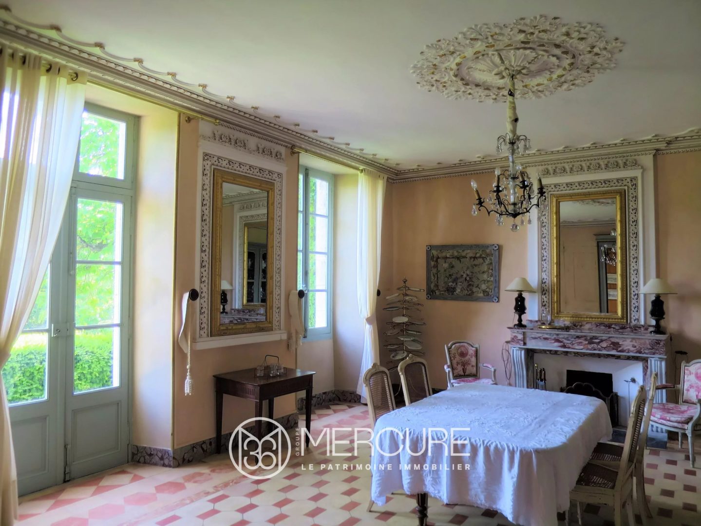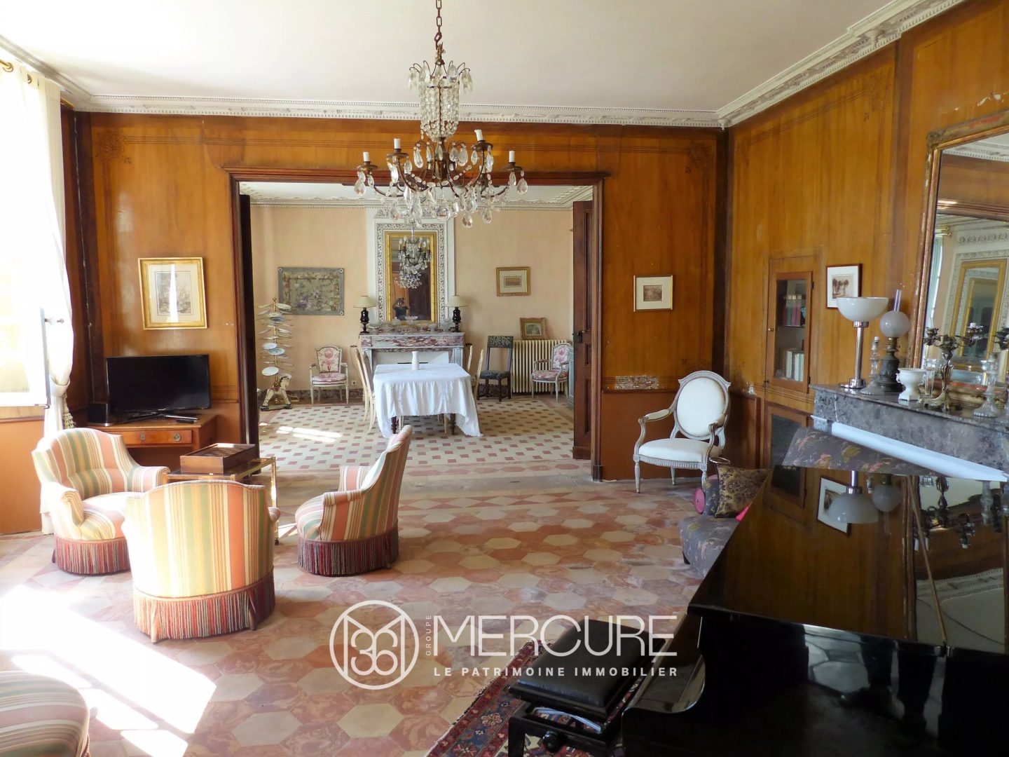 Ground floor: Beautiful main entrance hall with an original monumental stone staircase and wrought iron railing, 2 adjoining reception rooms of 66 m², adjoining library of 17m².