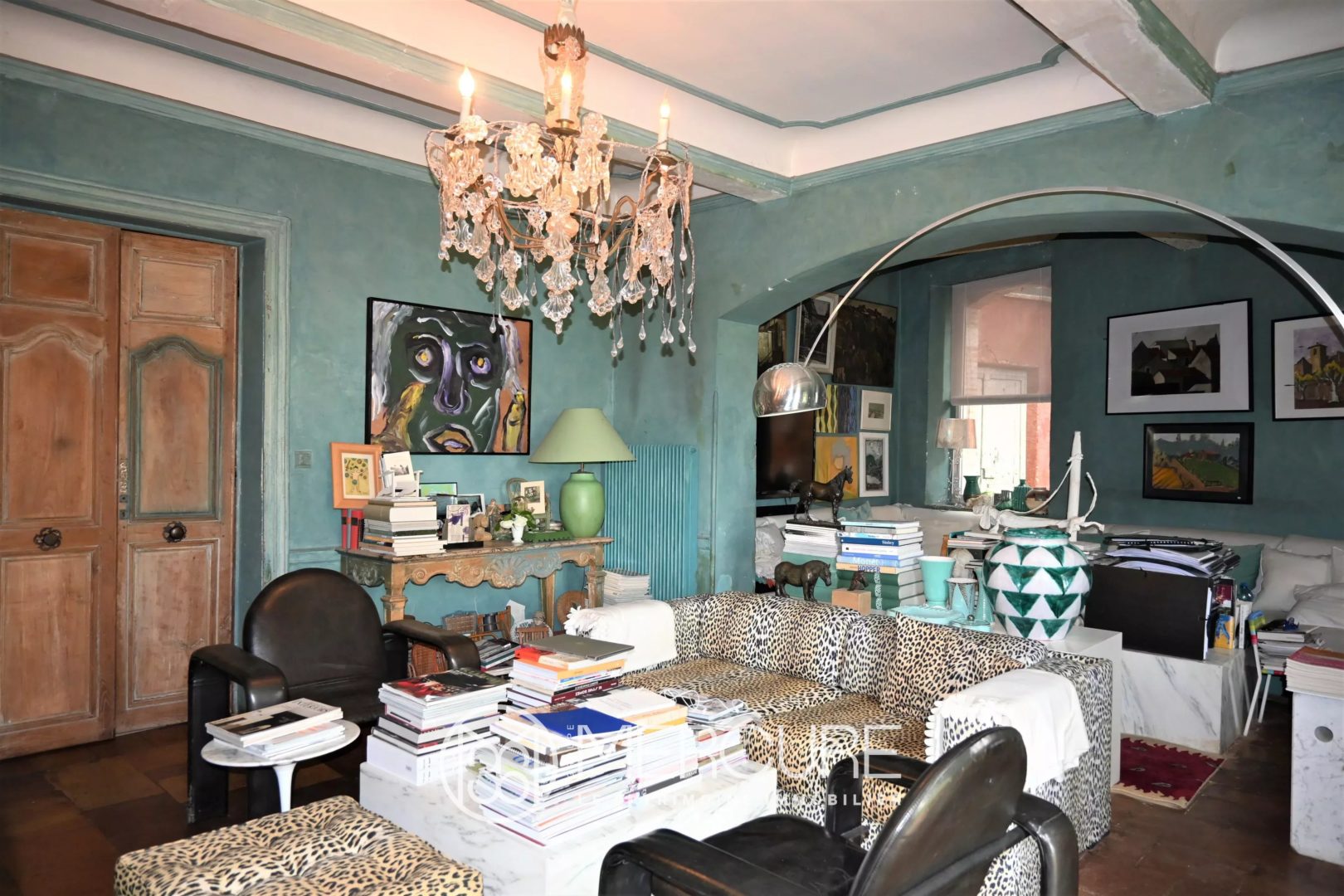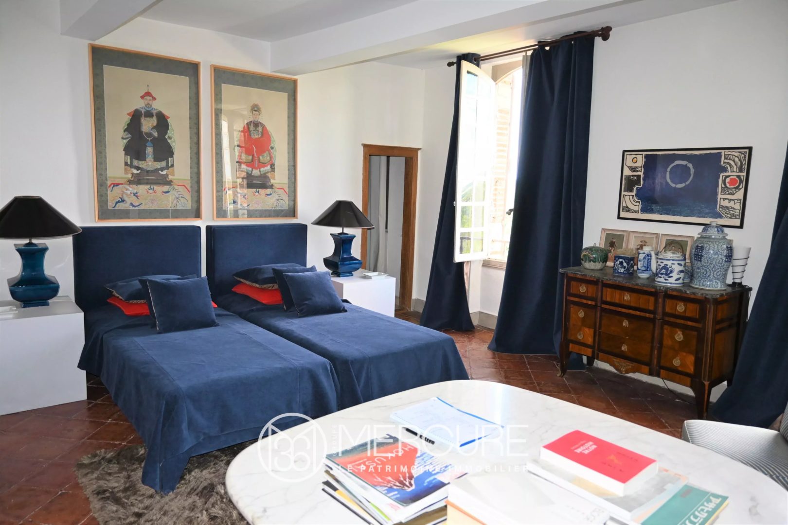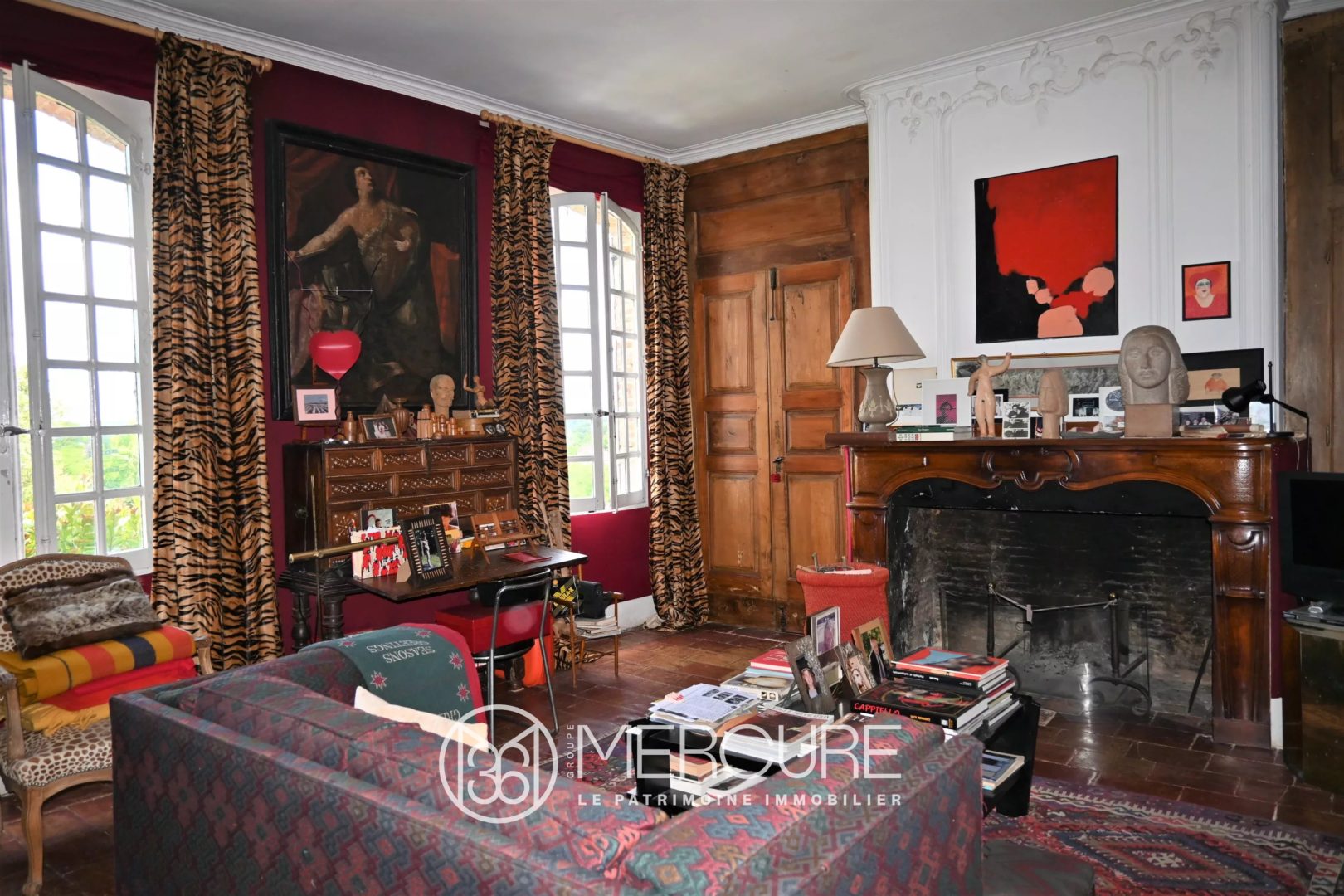 Garden level: Entrance hall 27m ², bedroom 15m² with sink, large living room 36m², dining room 28m², fitted kitchen 19m² and storeroom 10m². Direct access for these 3 large rooms to the garden, terraces / views. In the hall, beautiful wooden staircase and wrought iron of origin.