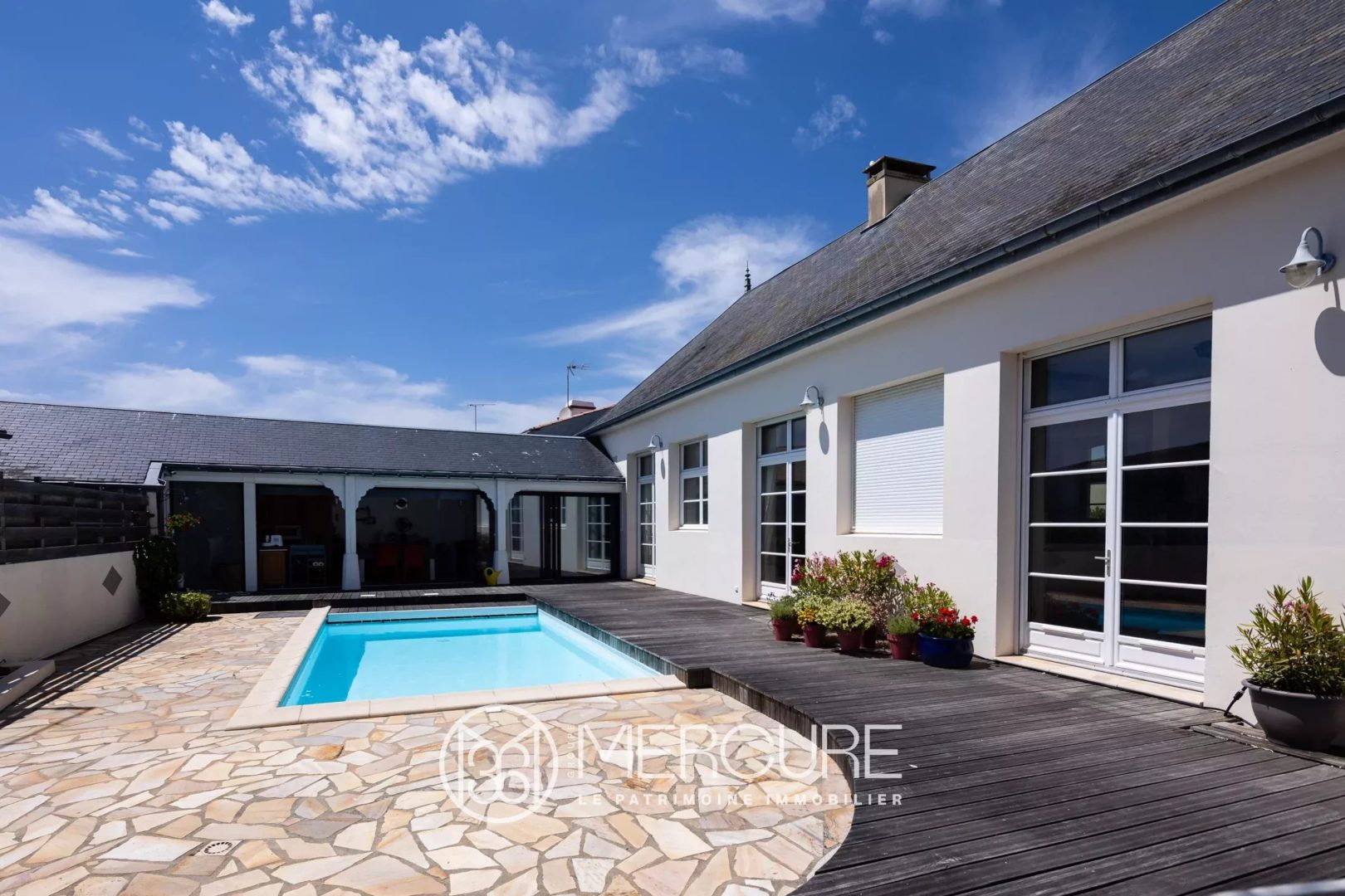 Benefiting from an excellent location, it also includes a large garage, a swimming pool and pool house, workshop and summer kitchen. High ceilings, stone walls and stained glass windows create a warm atmosphere.