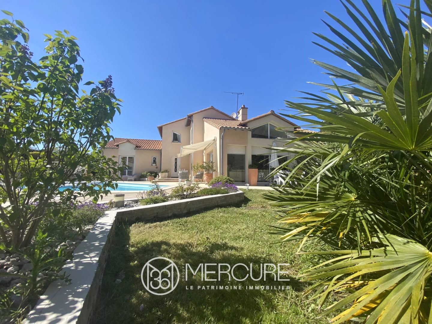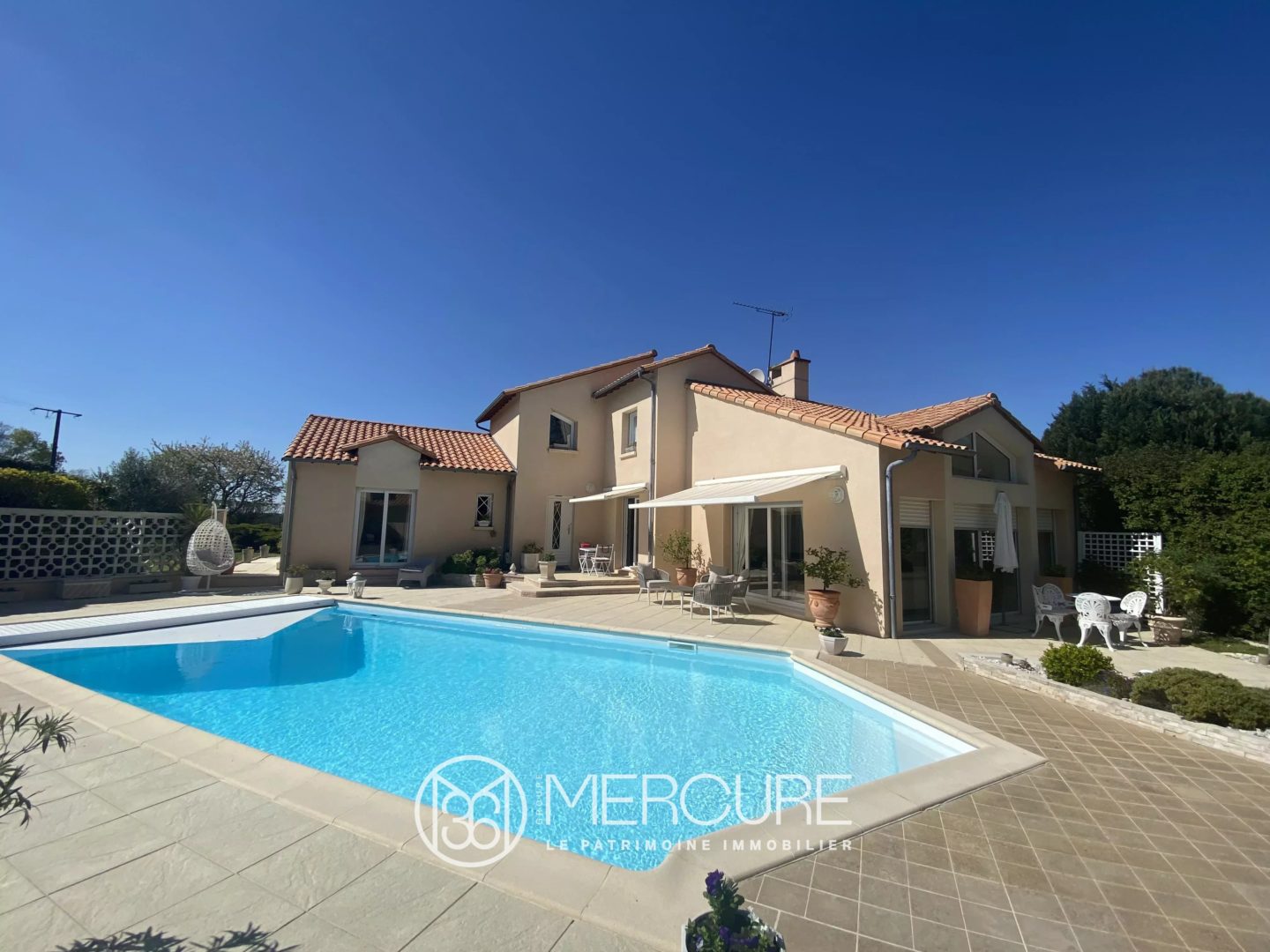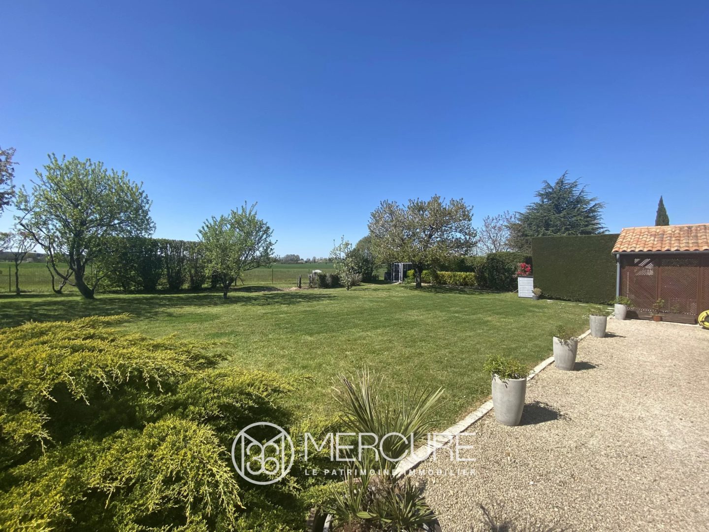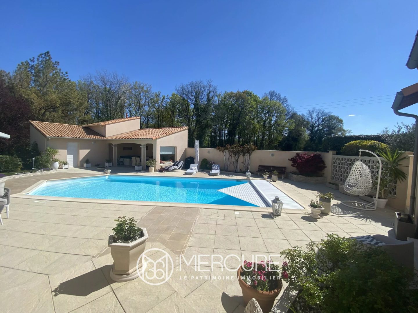 Le terrain : clos, sans vis à vis et planté d’une surface de 2497 m² avec piscine chauffée.