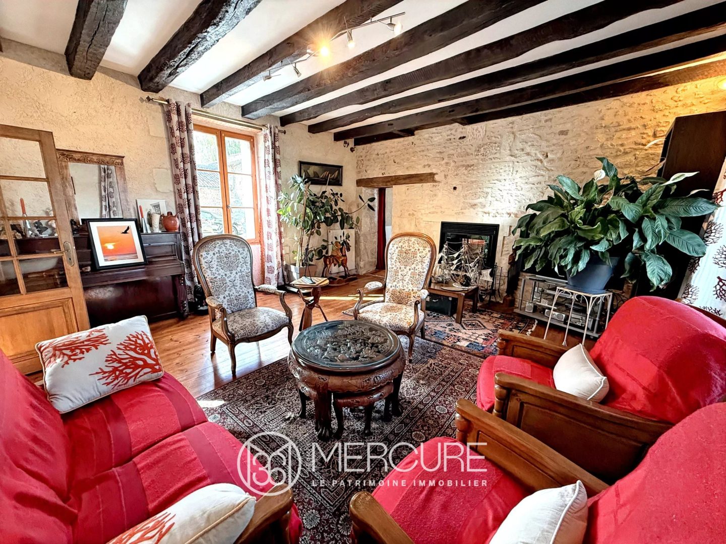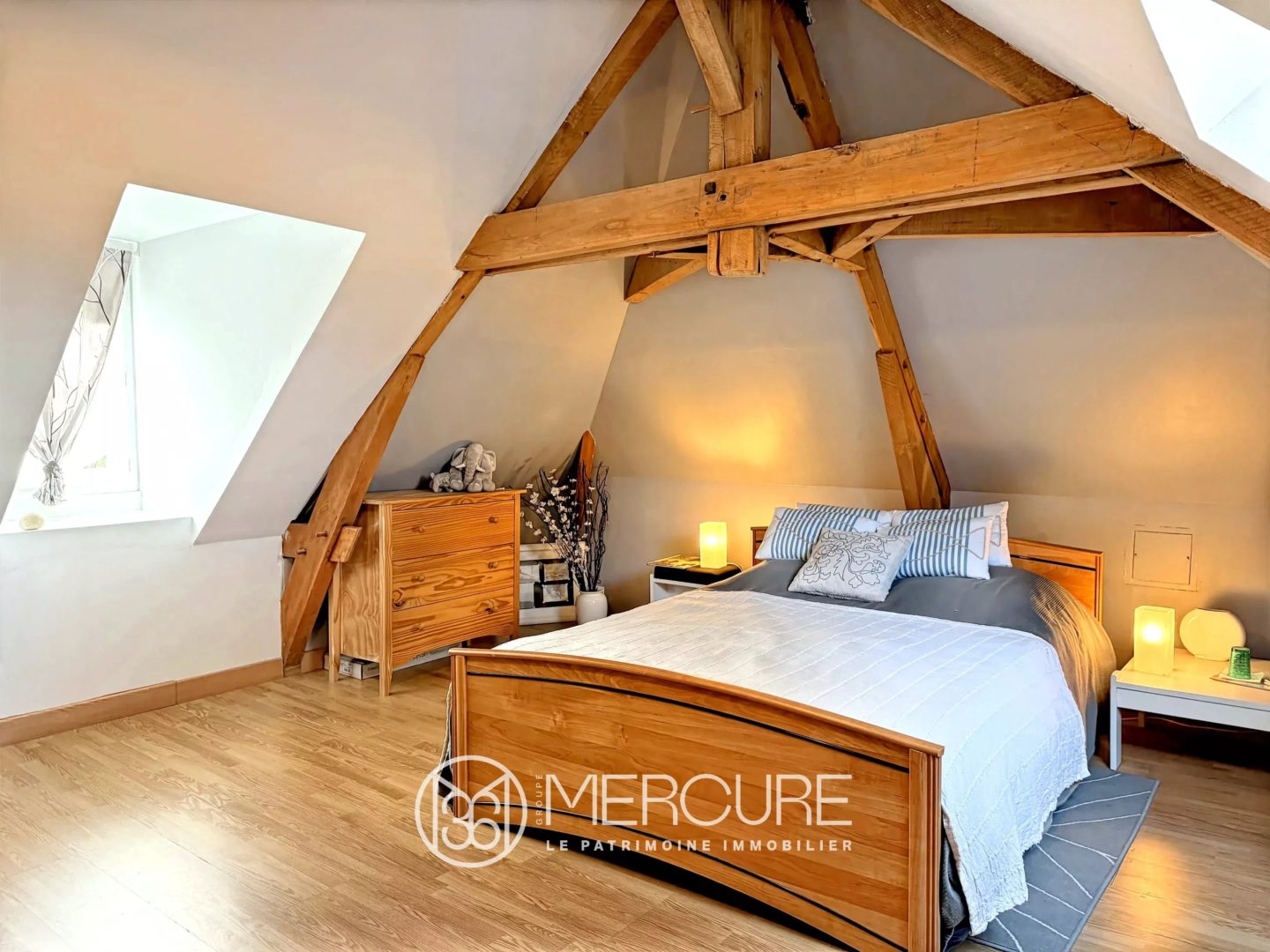 On the second floor, there are two bedrooms with exposed beams and a recently built bathroom with a toilet.