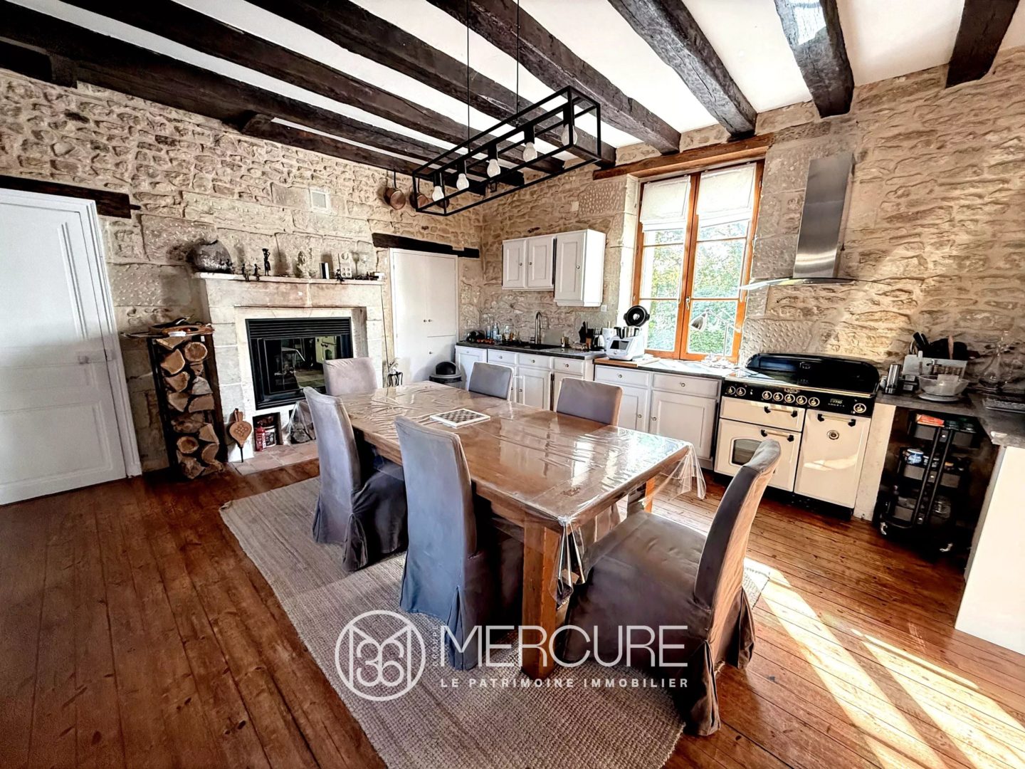 The ground floor, featuring parquet flooring throughout, comprises an entrance hall with a staircase leading to a living room with a double-sided fireplace insert, a dining room with a monumental fireplace, and a secondary staircase leading to a separate office. On the other side are a fitted kitchen, a hallway with a tertiary staircase leading to a second separate office, and a laundry room with a toilet.