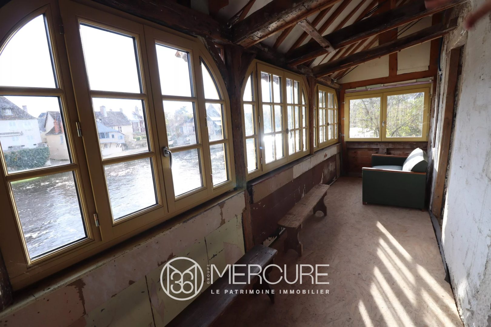The 113 sq. mt. apartmen offers a 48 sq. mt. fitted kitchen/living room, a 10 sq. mt. terrace with splendid views over the river Creuse, a 6 sq. mt. entrance with WC, a 18 sq. mt. bedroom with bathroom, a second bright bedroom of 31 sq. mt. with bathroom and WC.