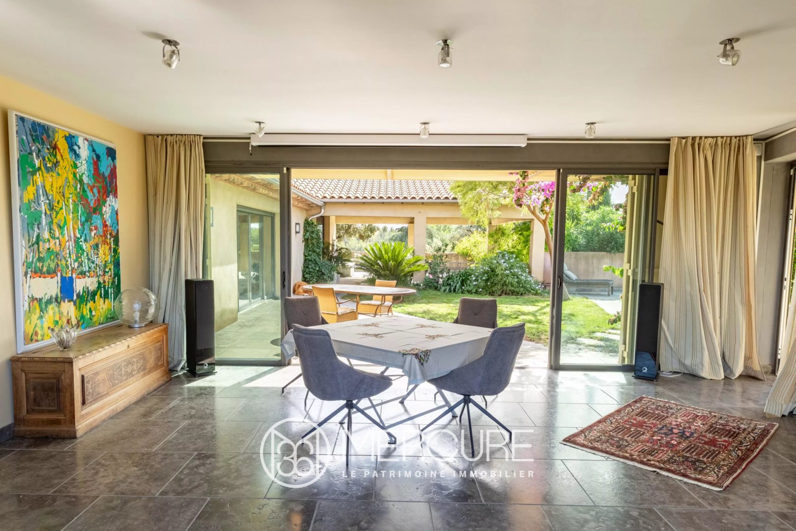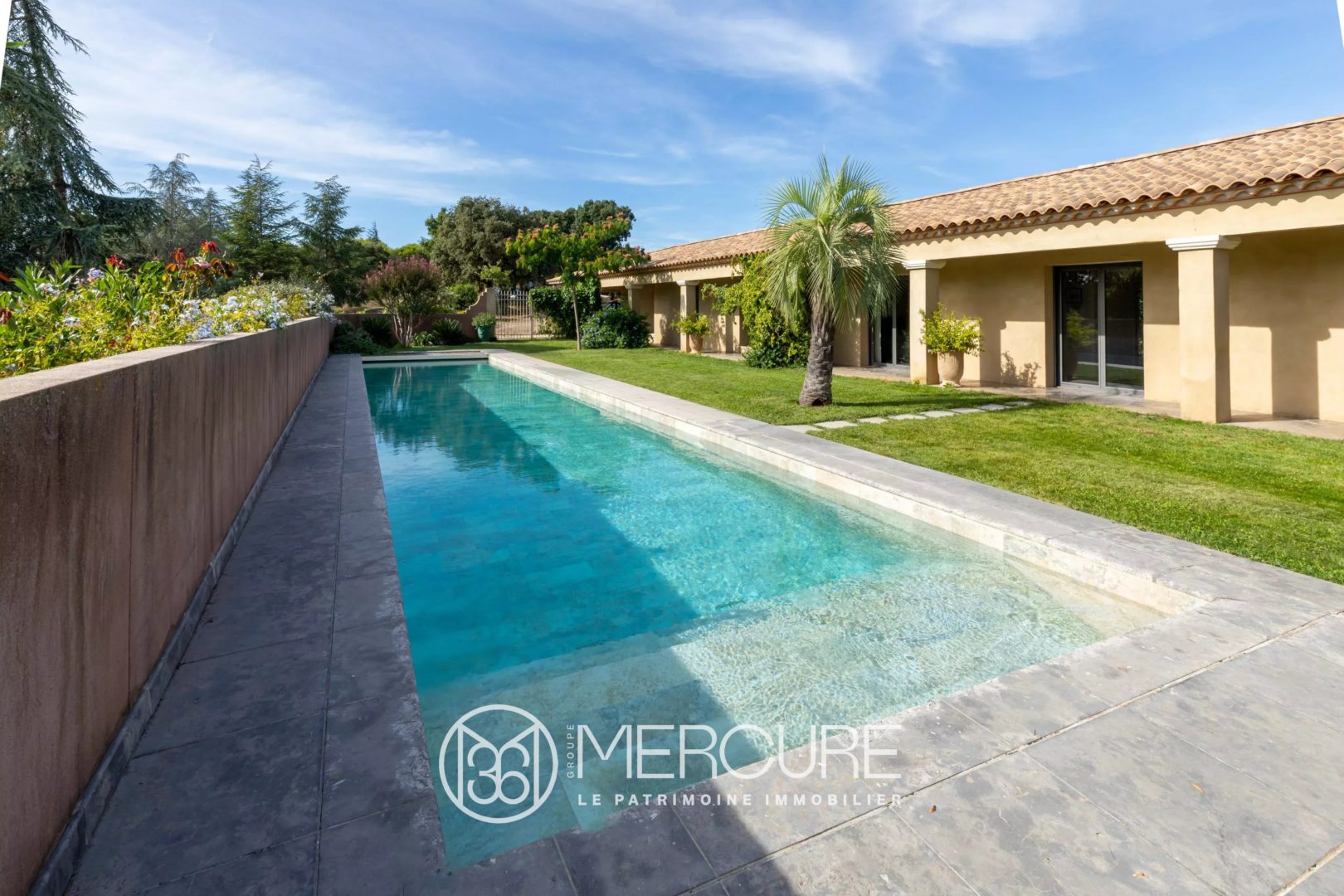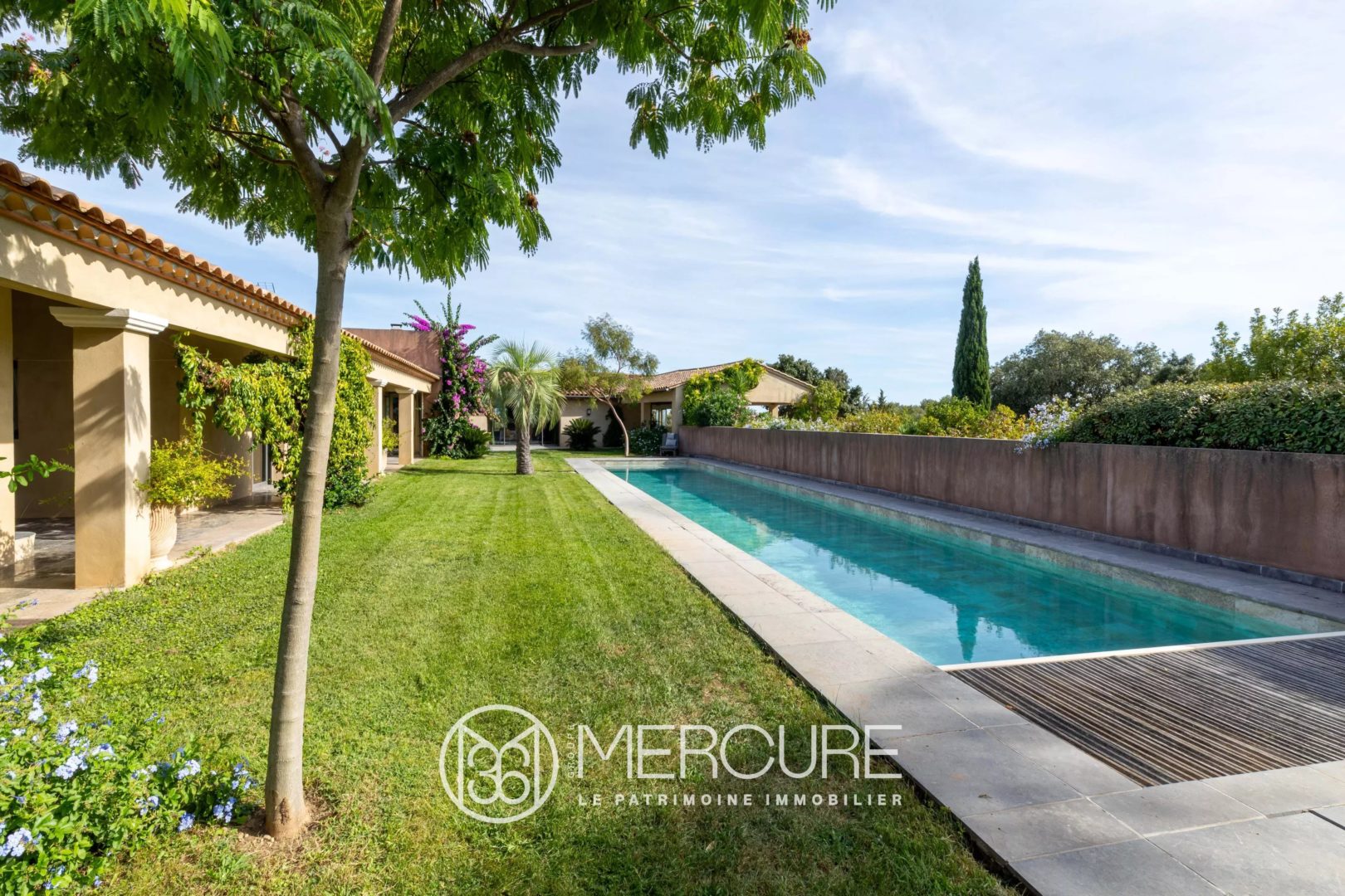 Disposée en L autour du jardin la maison offre une surface habitable d’environ 270m². Elle se compose d’une élégante réception enfilade : très grand salon traversant, salle à manger avec cuisine équipée ouverte haut de gamme et un autre salon également en double exposition avec home cinéma, 4 chambres 3 salles d’eau, 3 toilettes dont 2 indépendants.