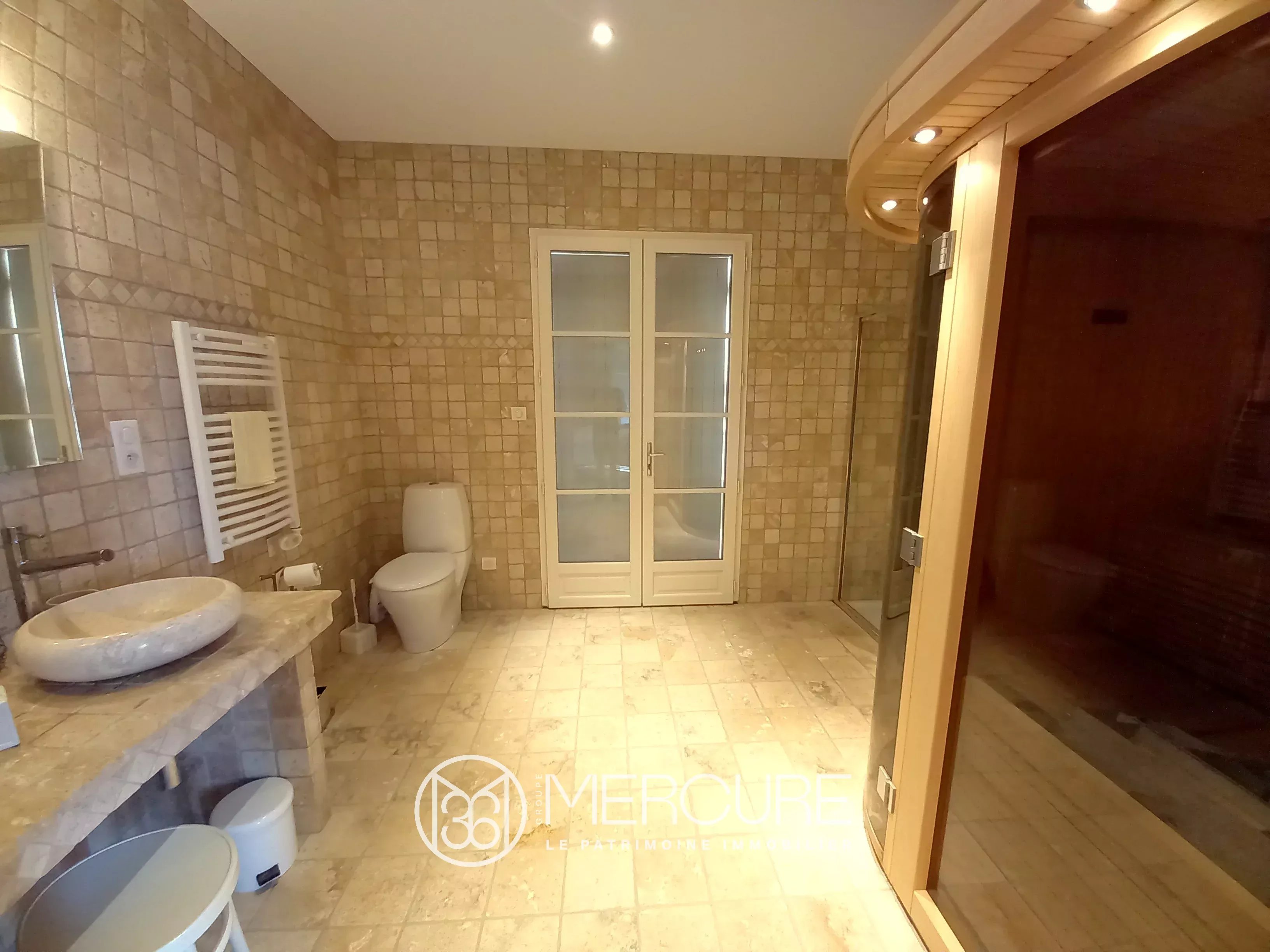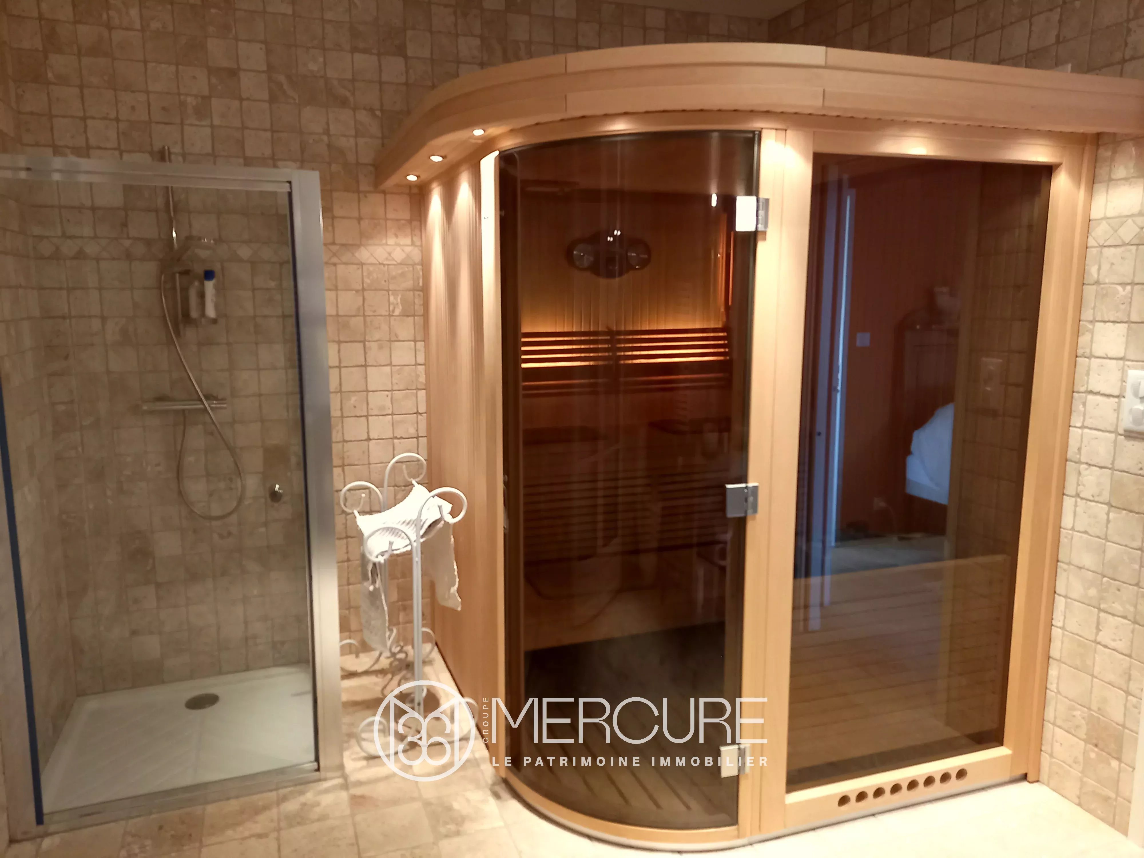 Ground floor: large living room with dining area, sitting room with wood-burning stove and library, kitchen opening onto a south-facing covered terrace with barbecue. One ground-floor bedroom with private shower room, toilet and sauna. Other toilet. Laundry room with access to a double garage and boiler room.