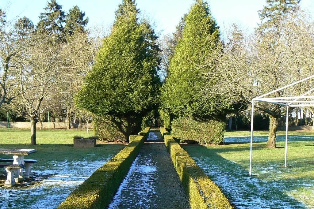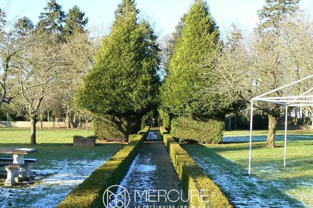 Parc plat soigné sur 15800m² clos, agrémenté d’allées de buis et de tilleuls, d’une ancienne serre et d’une piscine.