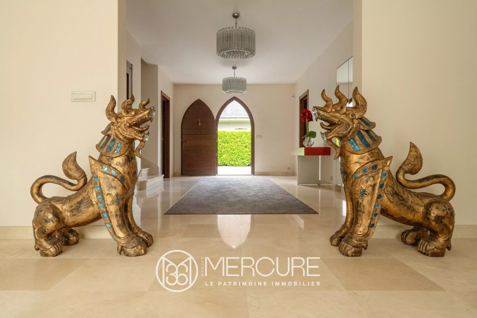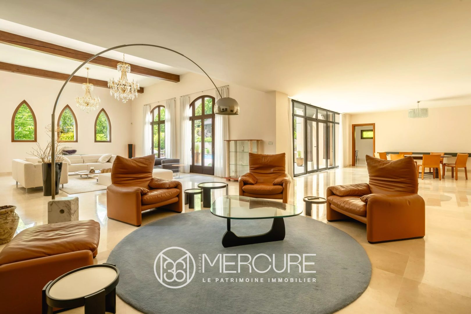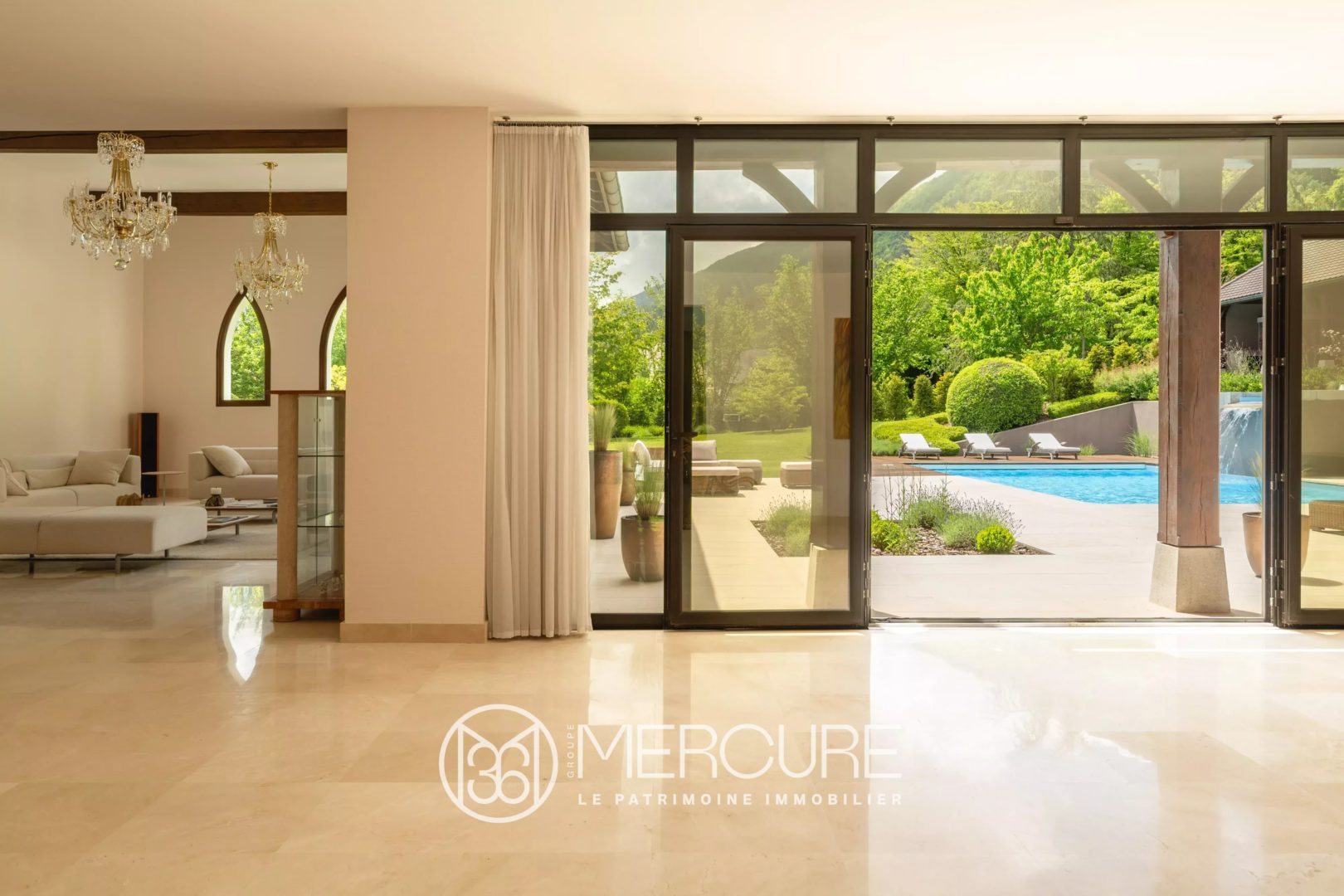 On the ground floor, the elegant south-facing Burgundy stone terrace opens onto the pool and garden.