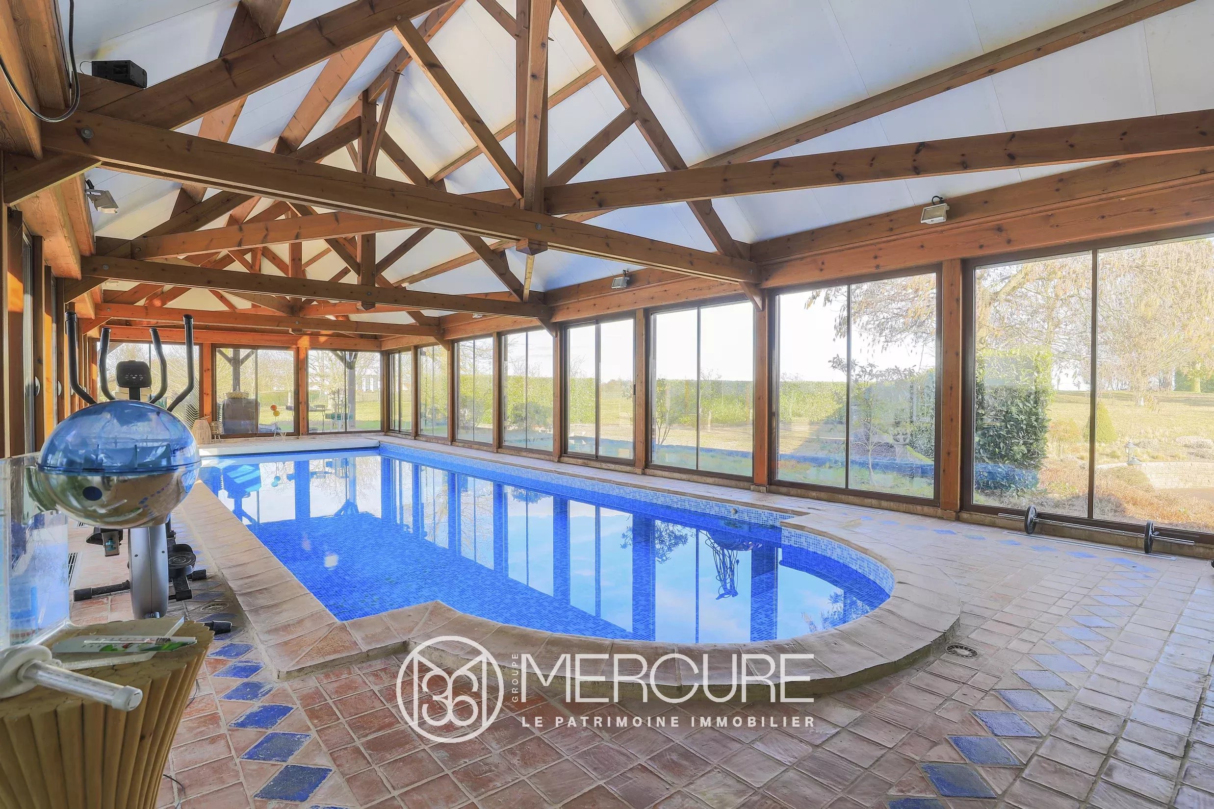 An access corridor leads to the indoor swimming pool, heated by a specific heat pump, fed by a rainwater recovery system, equipped with changing rooms and a toilet, and opening onto a large terrace.